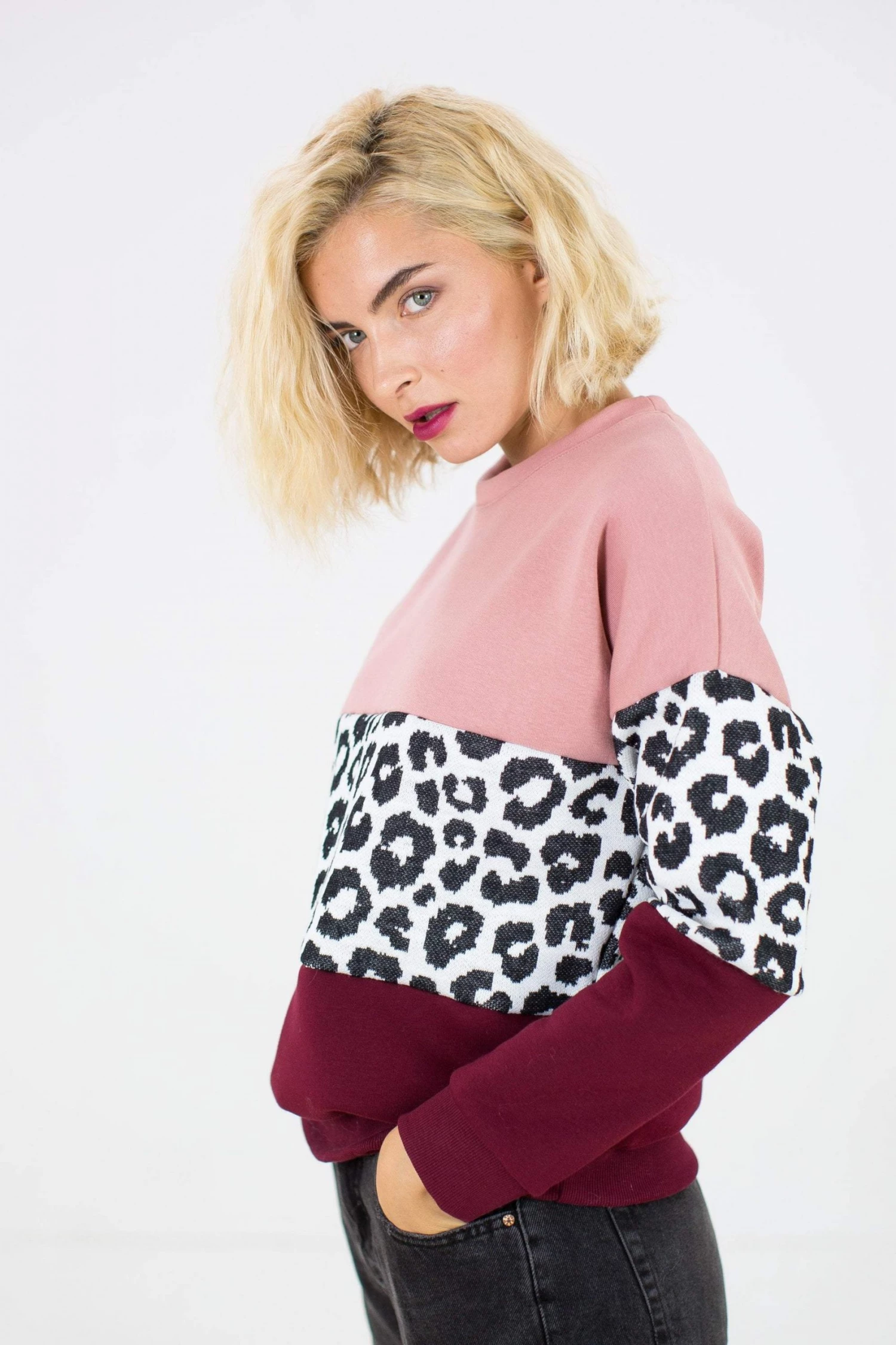Our beloved sweater Mia is back! Crafted from the signature color block, the top is a pastel rose, followed by a wild animal print block and an astonishing burgundy block at the bottom. A statement sweater, for a fun and cool outfit. Wear it with your denims and your fave sneakers! A piece that shouts ‘autumn is here’!