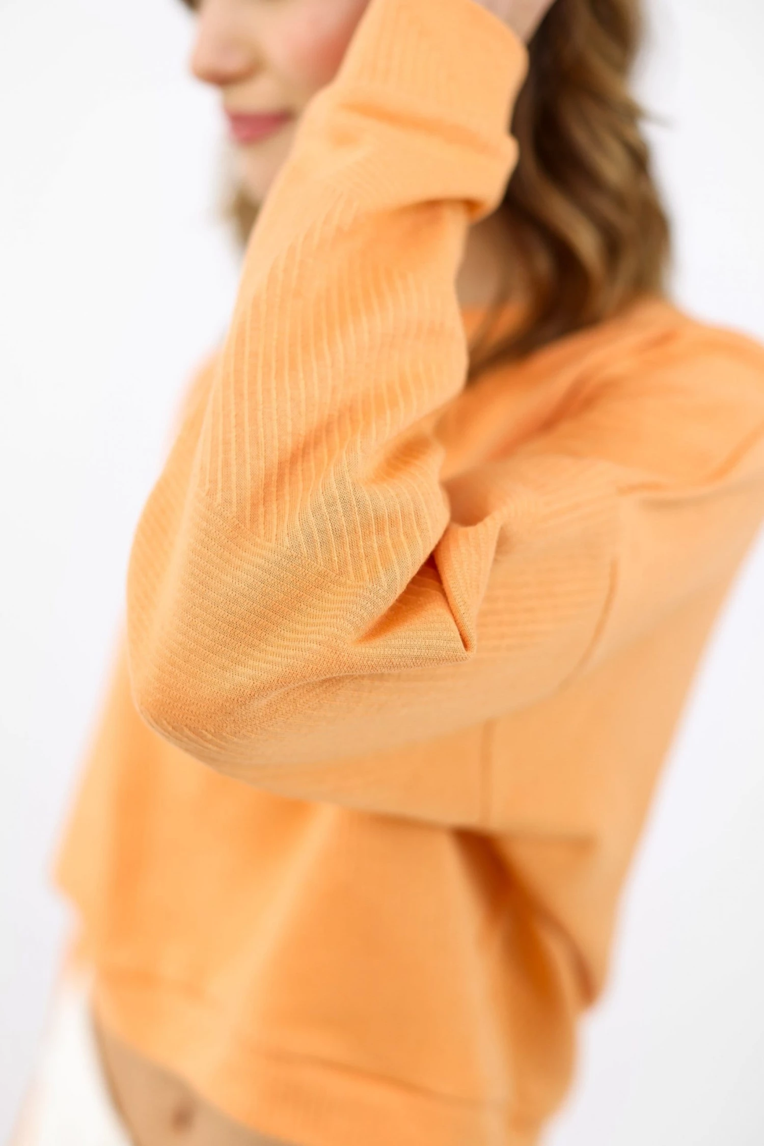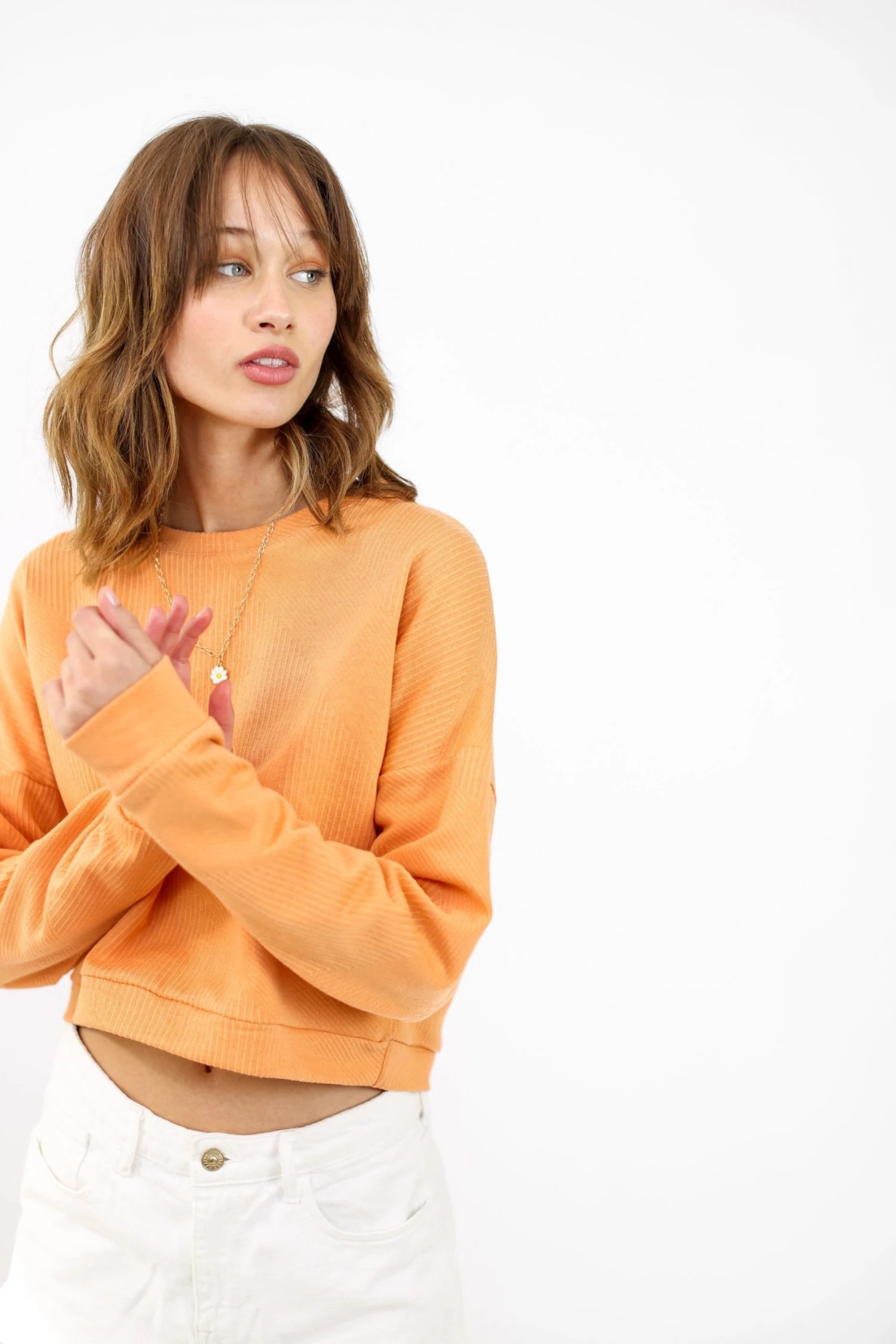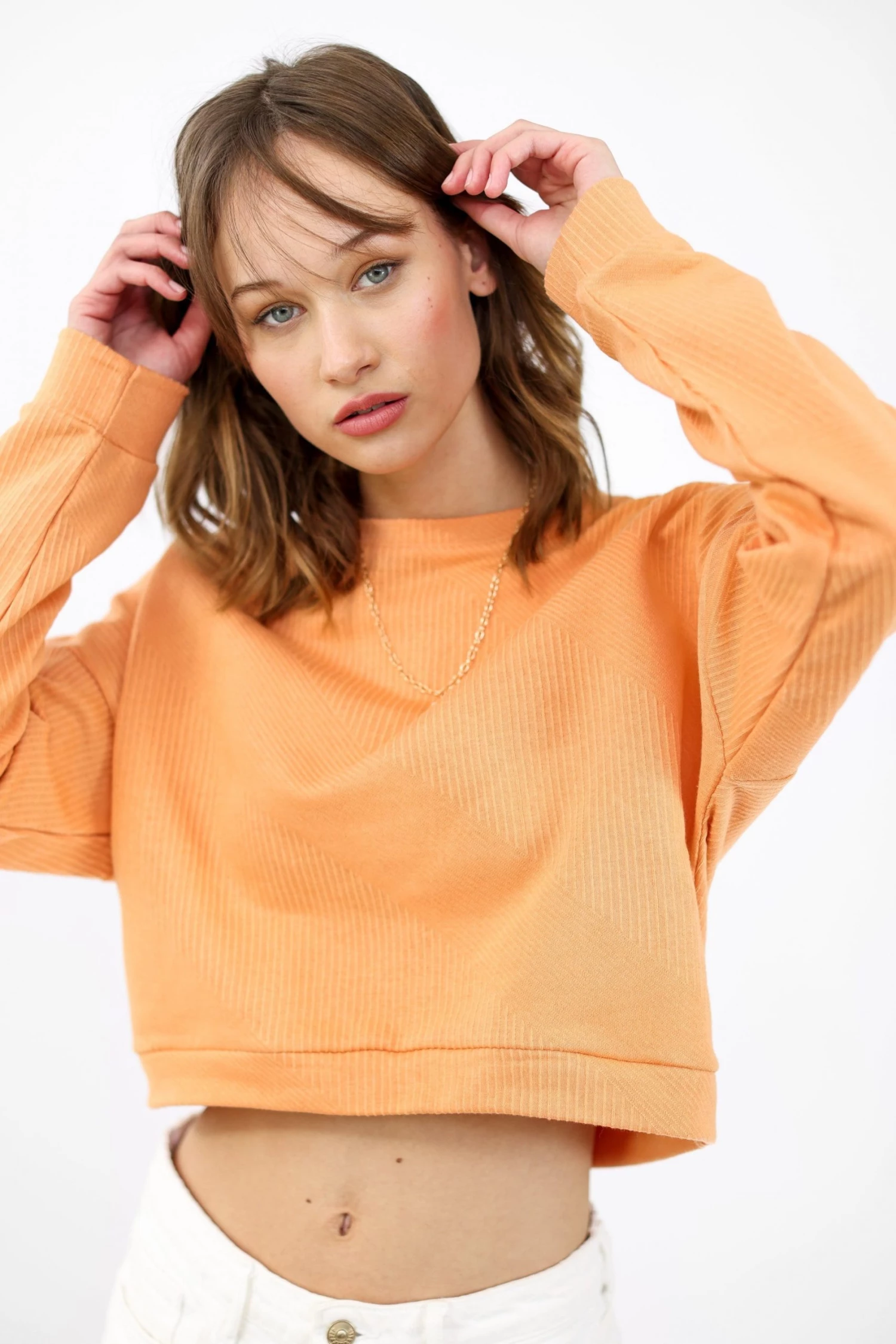 A crop textured sweater in peach. Super casual, super comfy, super cute! It has long sleeves and it goes perfectly with your high-waist jeans or sweatpants. Very soft feel for a comfy every day look (: