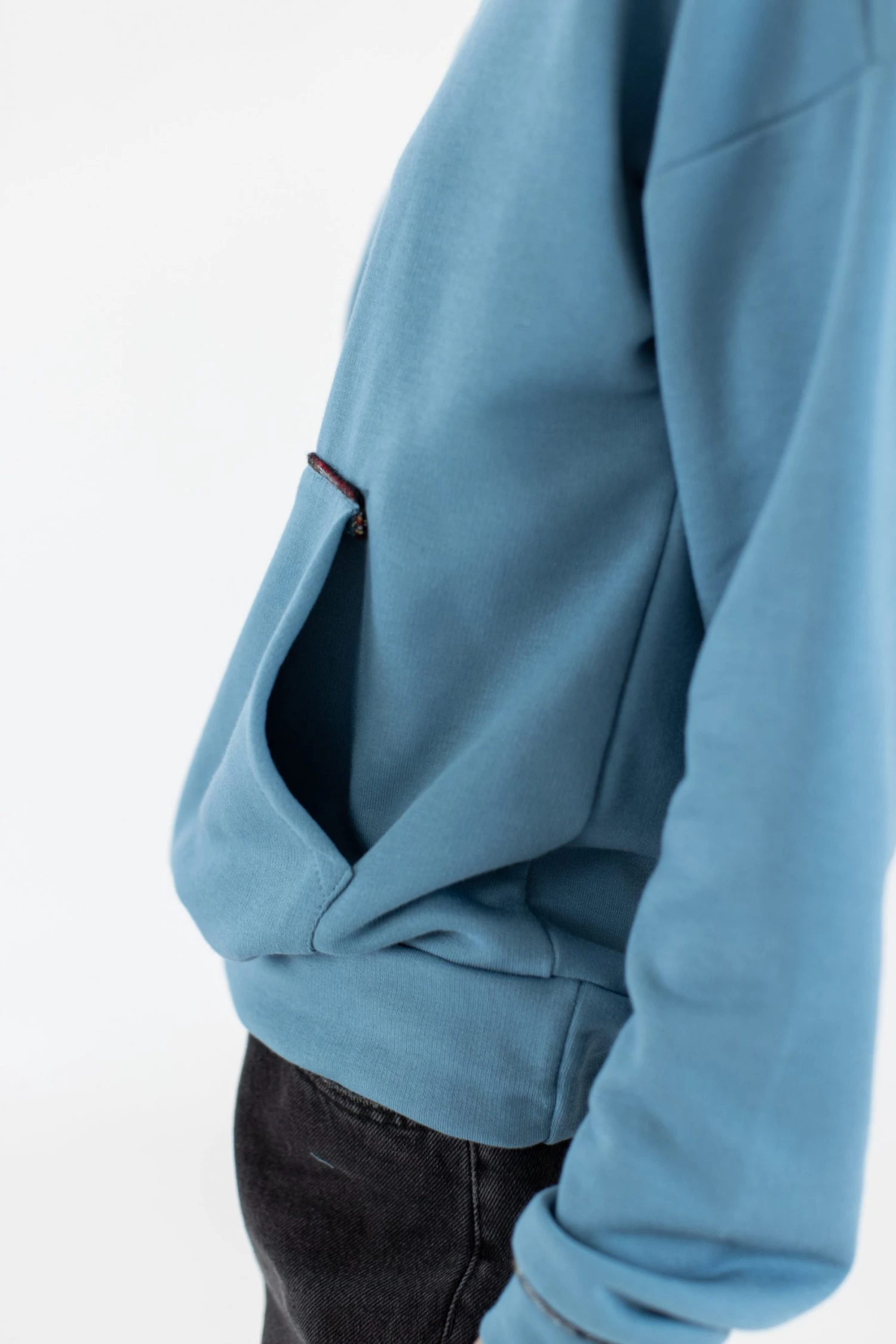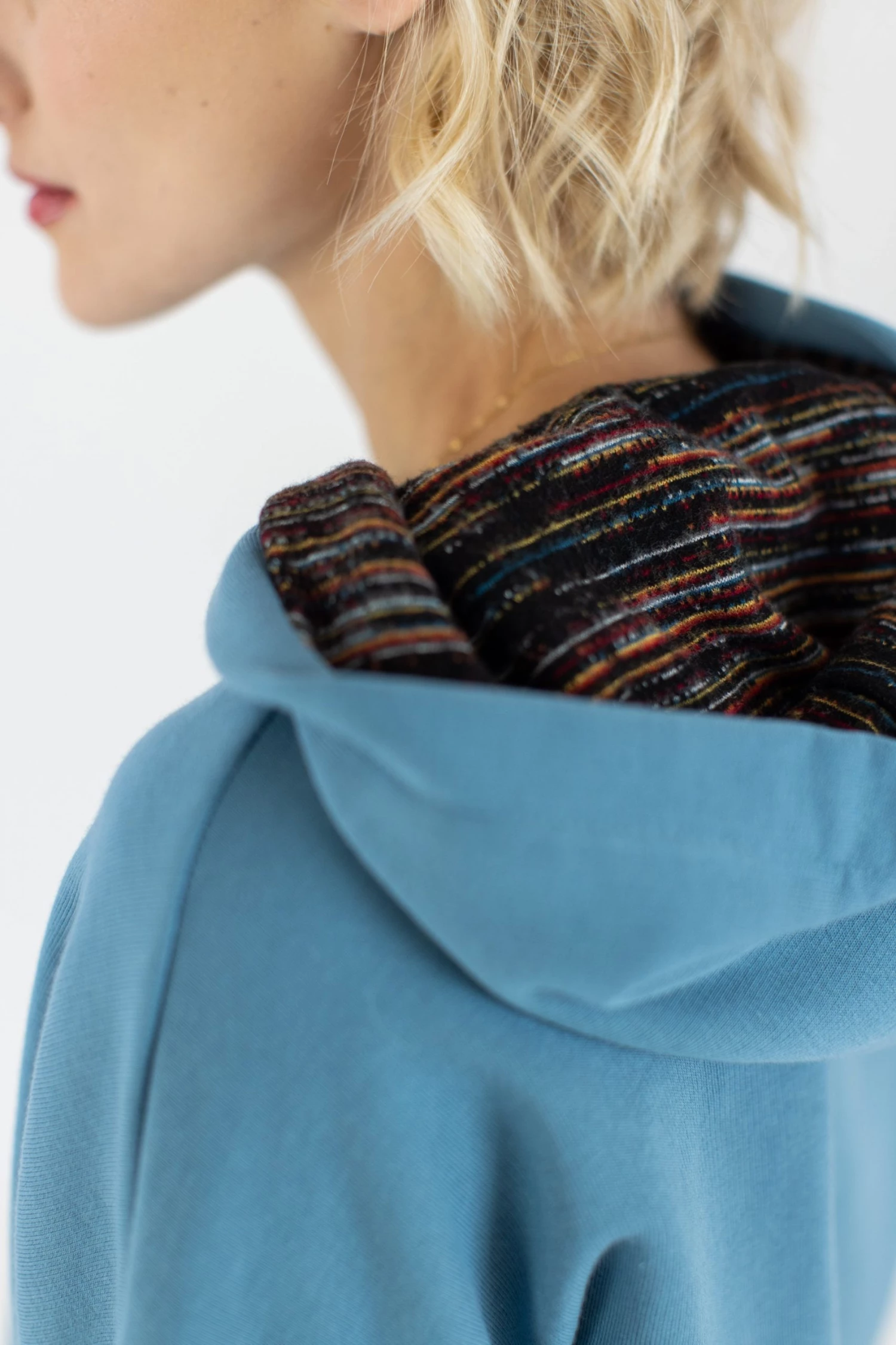 Our hoodie ‘Iris’ in petrol colored fabric! It’s cute and comfy,features a hoodie made of our black colorful fabric on the inside to keep you warm and a kangaroo pocket for a bag-free ride.Perfect sweater to light up your mood and keep you warm!Â