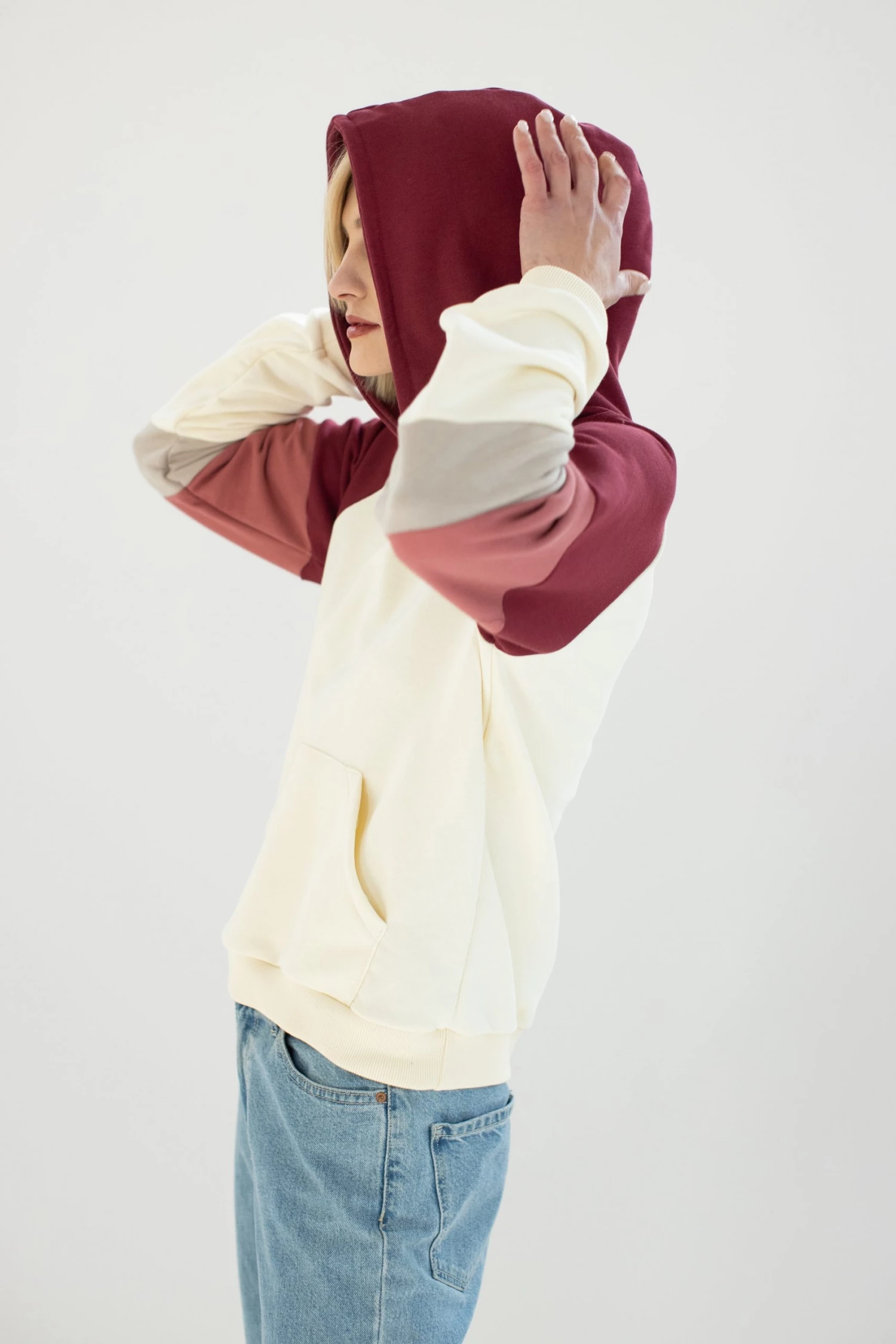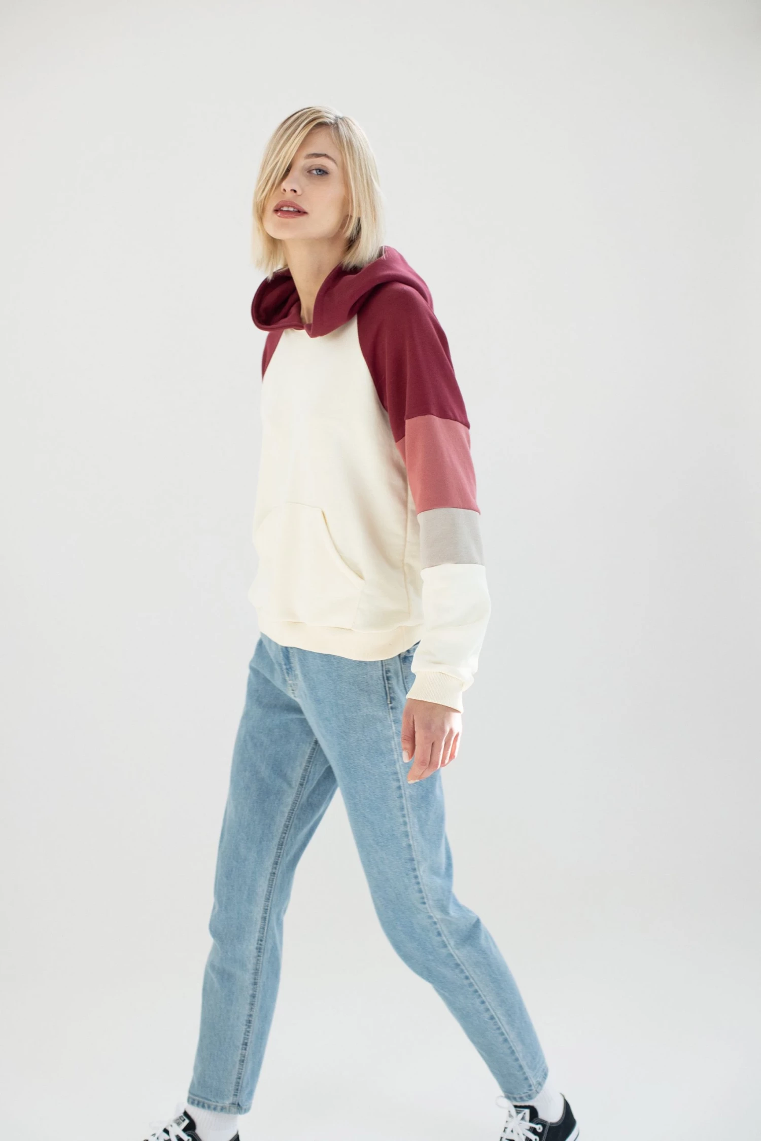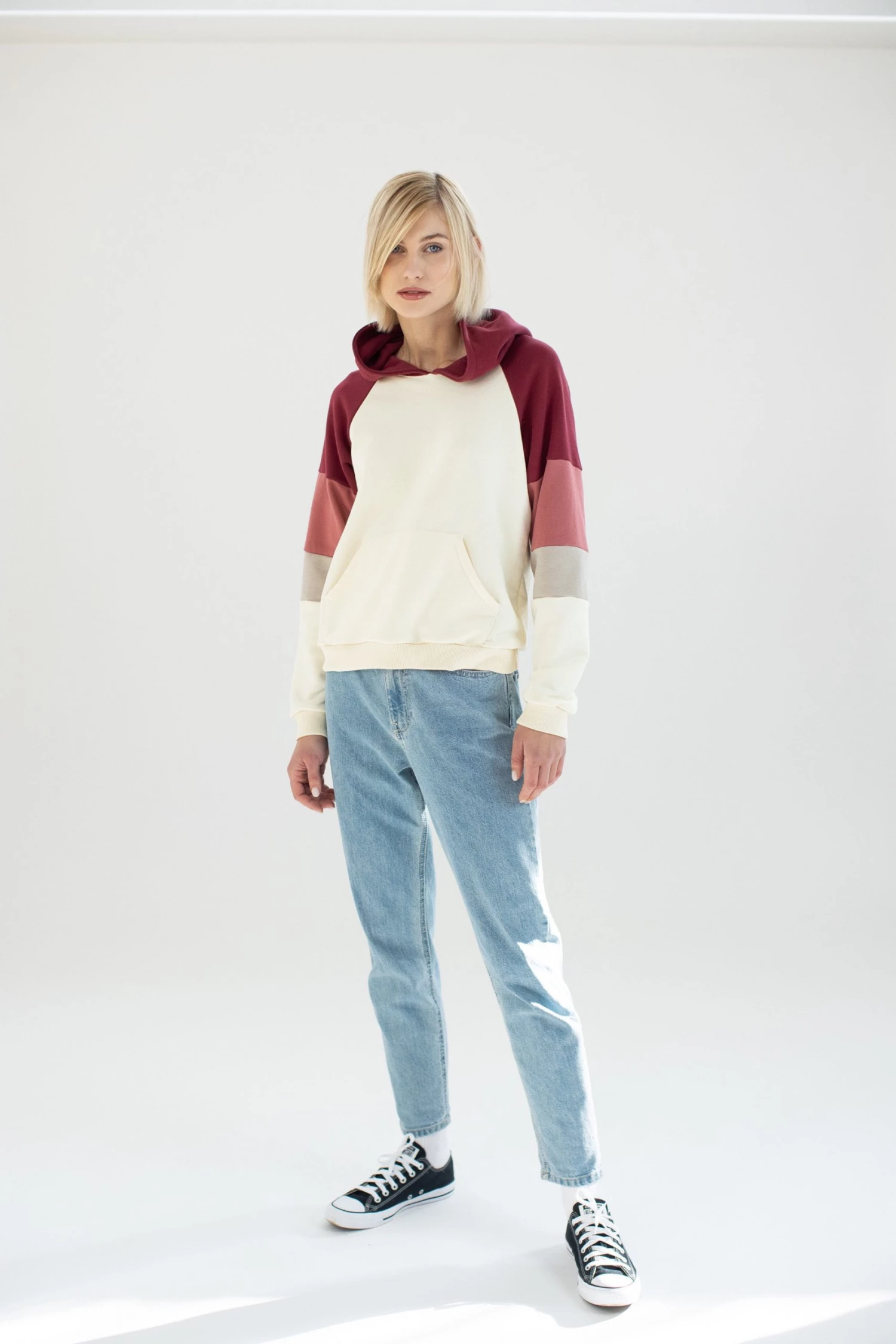 Our beloved hoodie ‘Remi’ in dark red, rasberry, beige and cream! It’s cute and comfy, with a hoodie to keep you warm and a kangaroo pocket for a bag-free ride. Easy to combine! Perfect sweater to light up your mood and keep you warm!Â