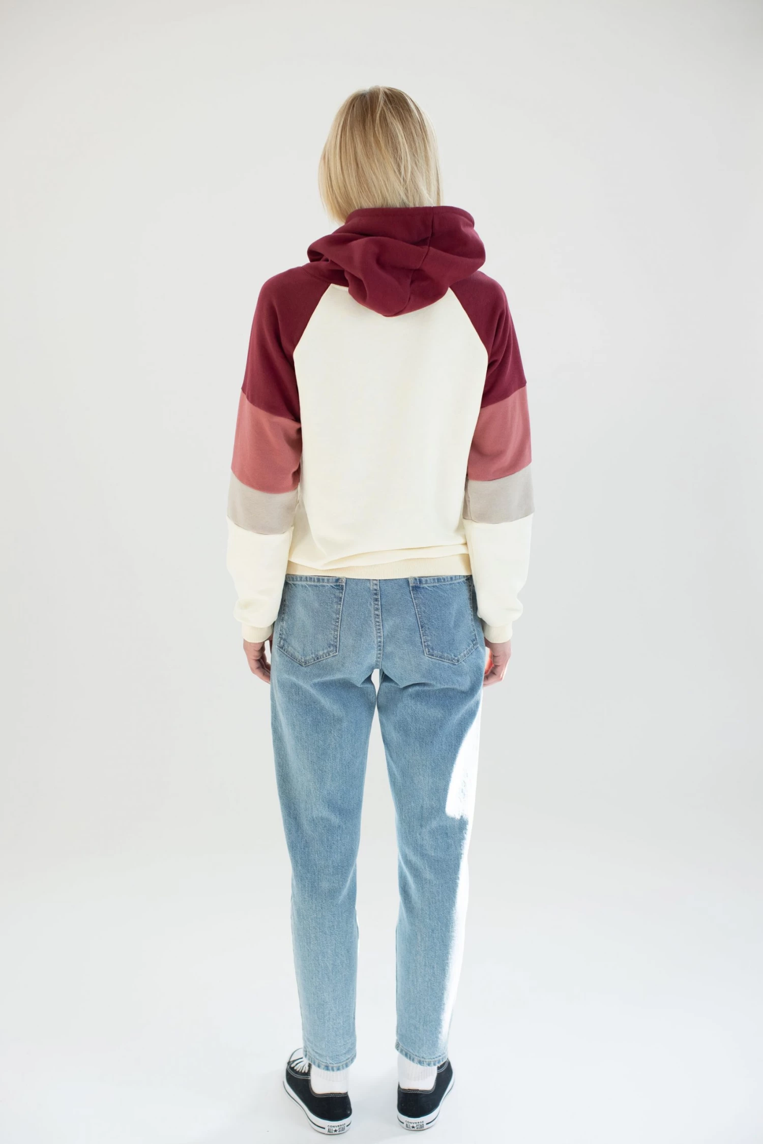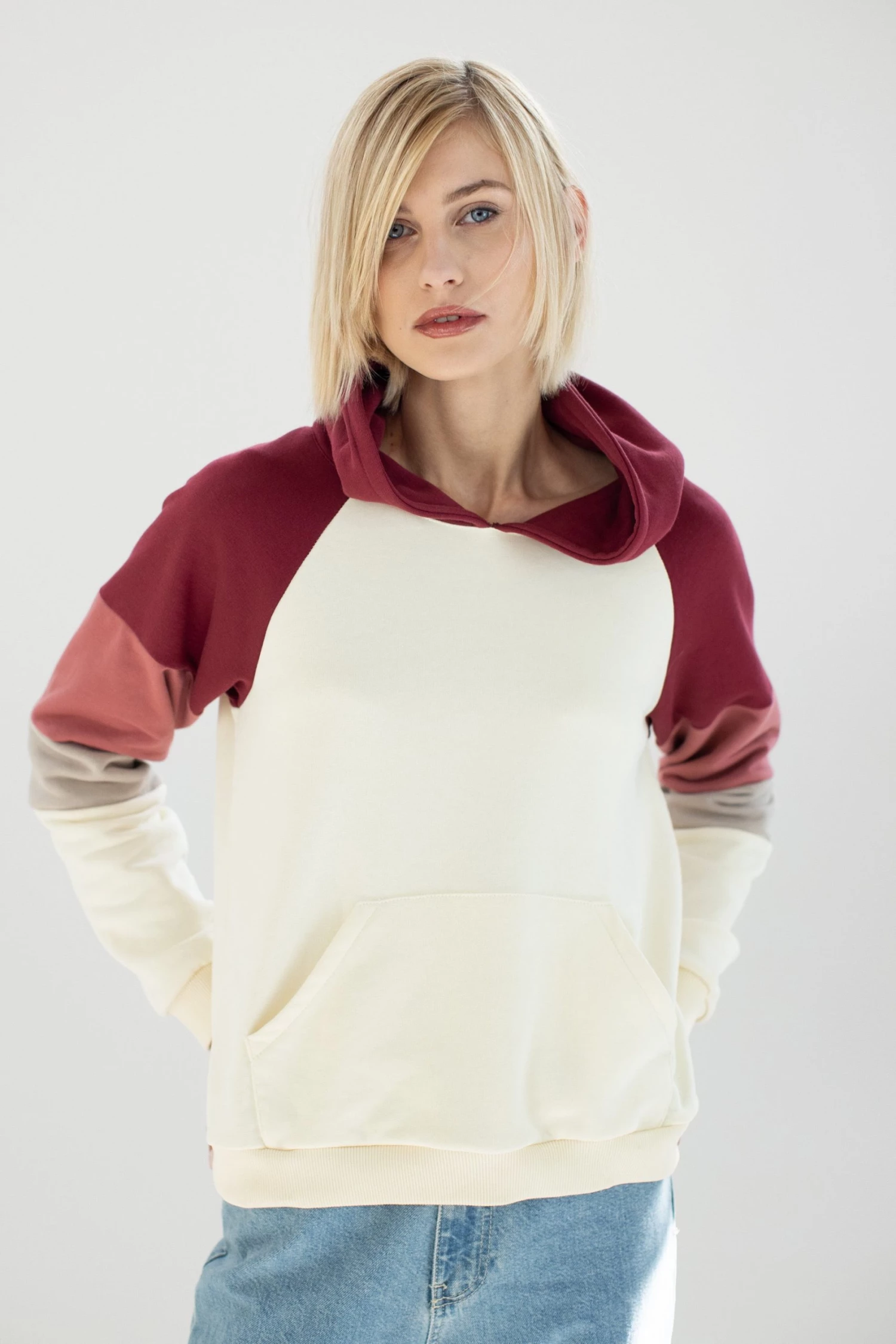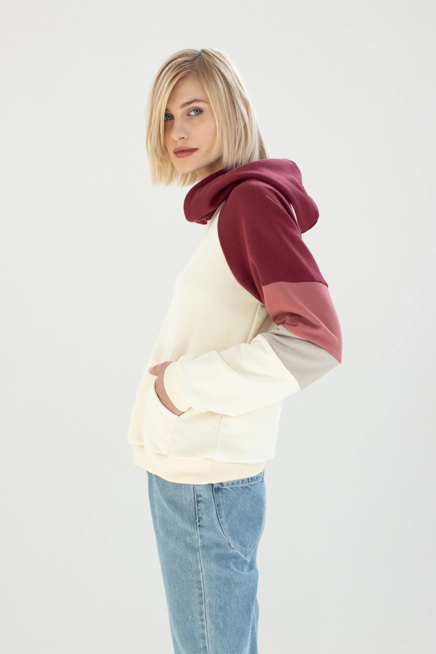 Our beloved hoodie ‘Remi’ in dark red, rasberry, beige and cream! It’s cute and comfy, with a hoodie to keep you warm and a kangaroo pocket for a bag-free ride. Easy to combine! Perfect sweater to light up your mood and keep you warm!Â