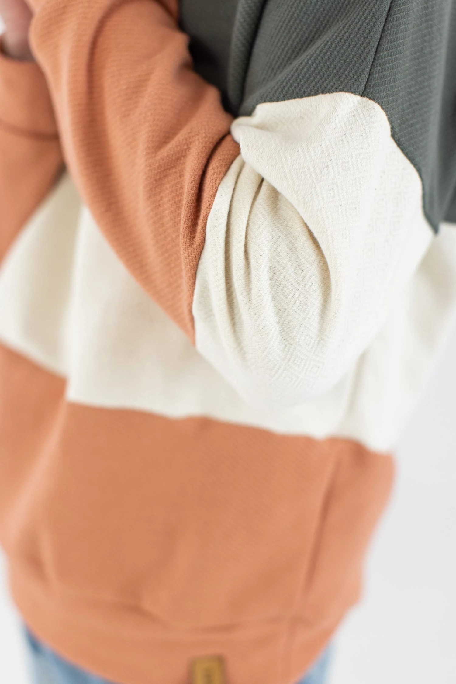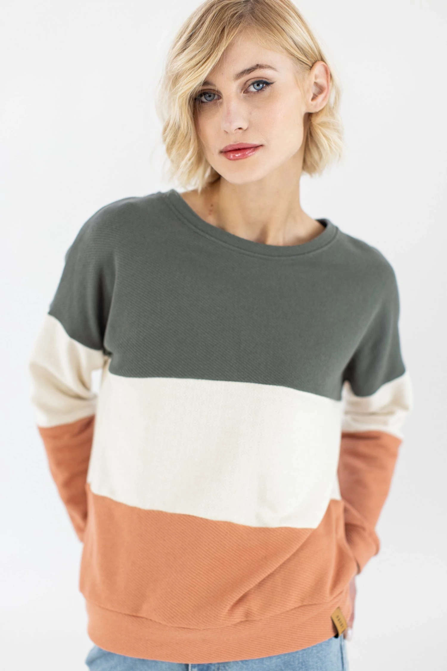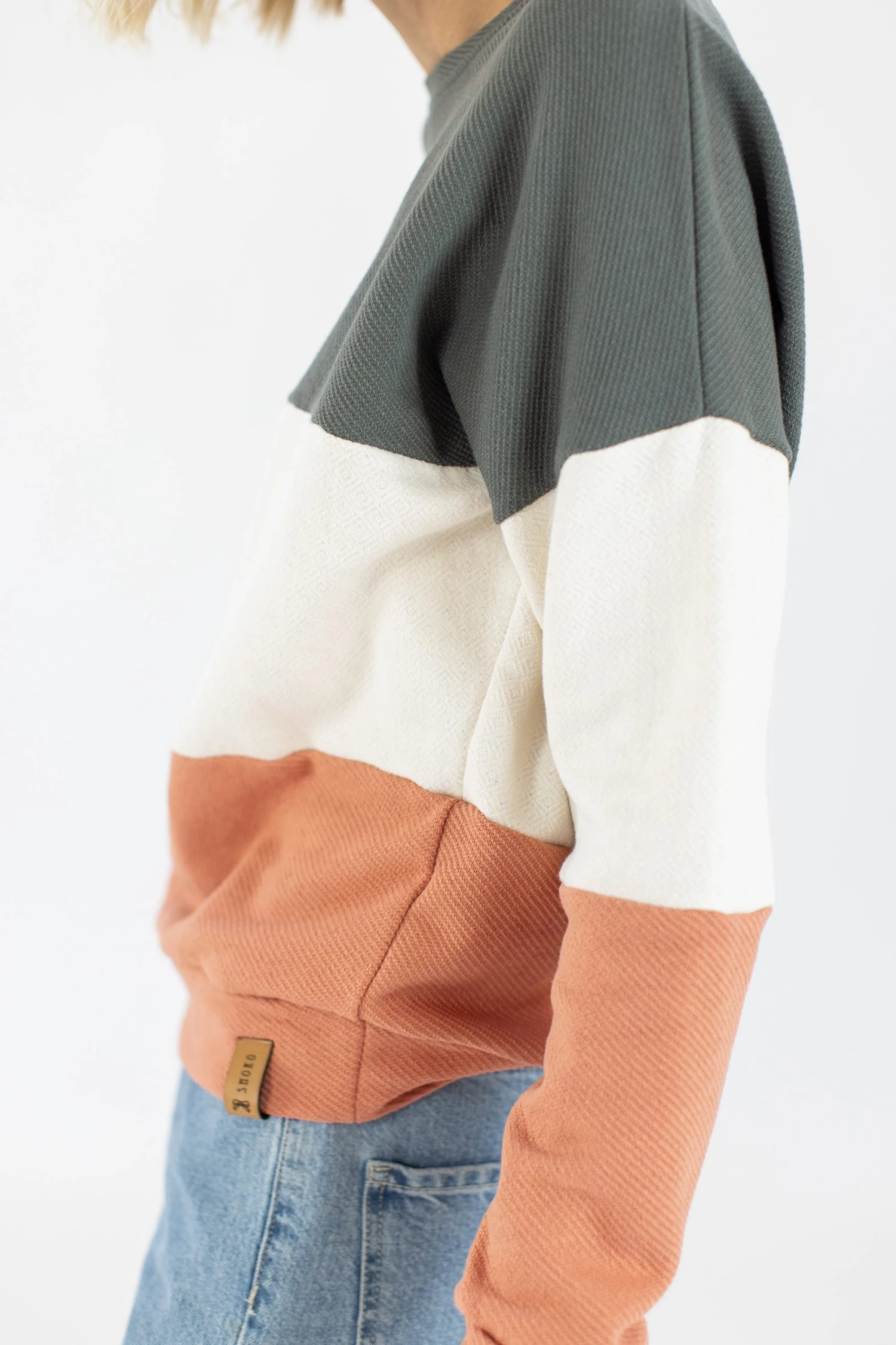Our favourite knit sweater Mia crafted from an old-school colour-blocking design. Dark grey at the top, following a cozy cream coloured fabric in the middle and finishing with a beautiful dusty pink fabric. A statement sweater, for a fun and cool outfit. Wear with a simple pair of denim and your fave sneakers!Â