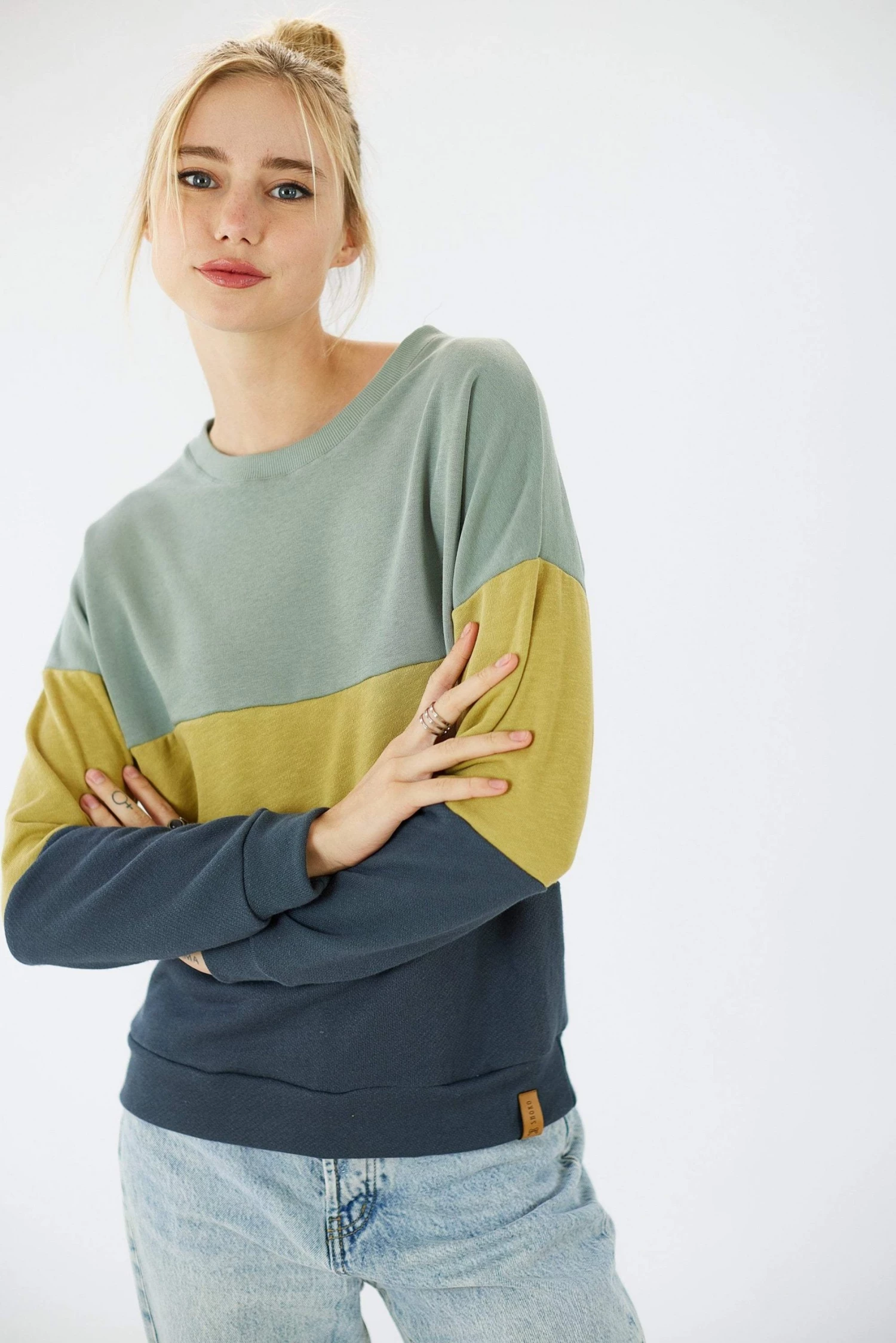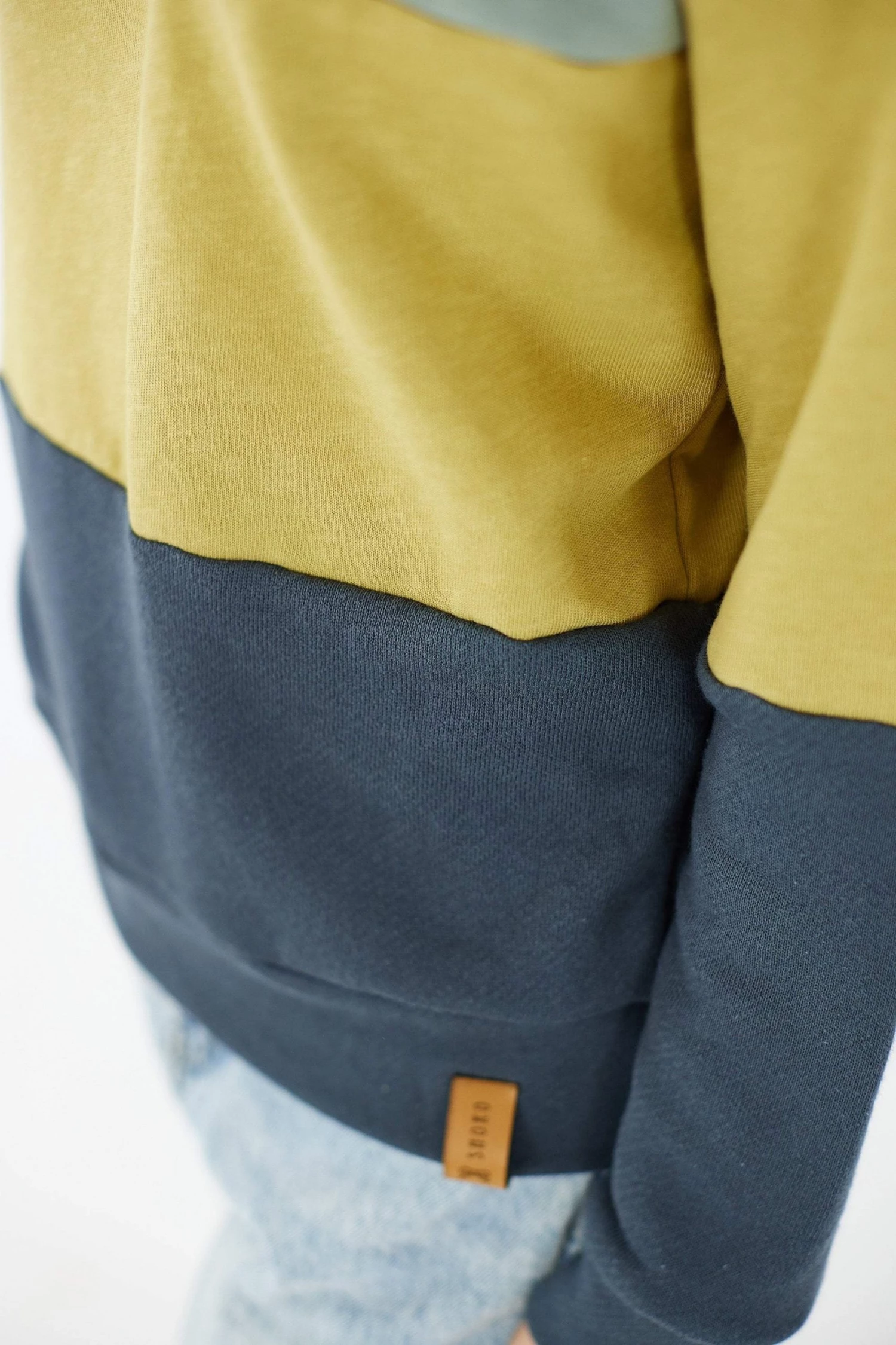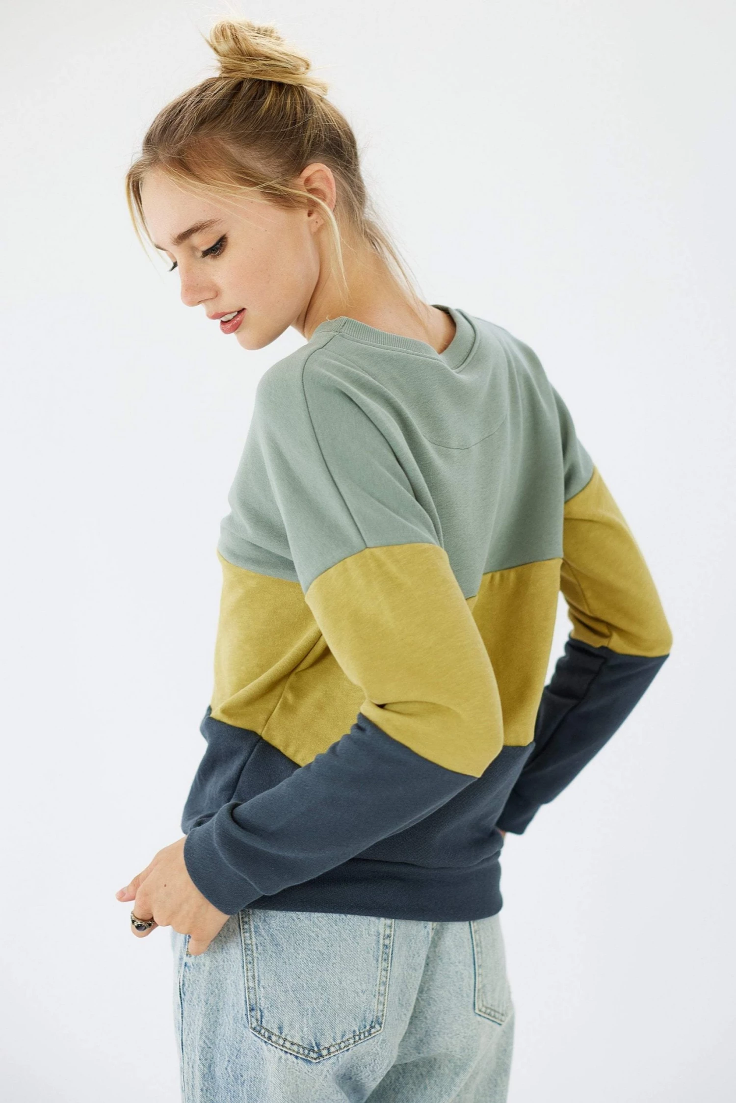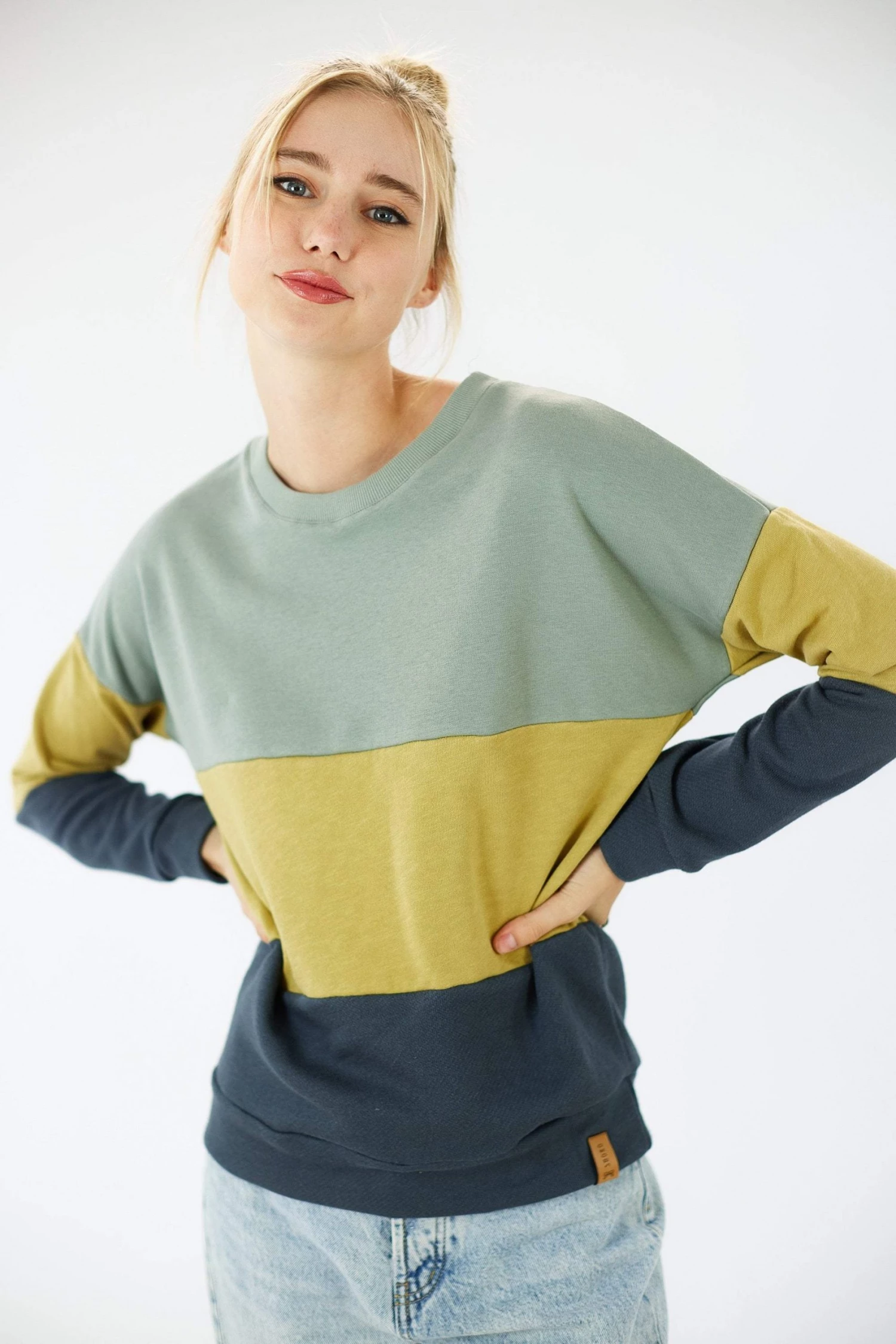 Our beloved sweater Mia is back! Crafted from the signature color block, the top is mint followed by a mustard block and an astonishing bluegrey block at the bottom. A statement sweater, for a fun and cool outfit. Wear it with your denims and your fave sneakers! A piece that shouts ‘autumn is here’!