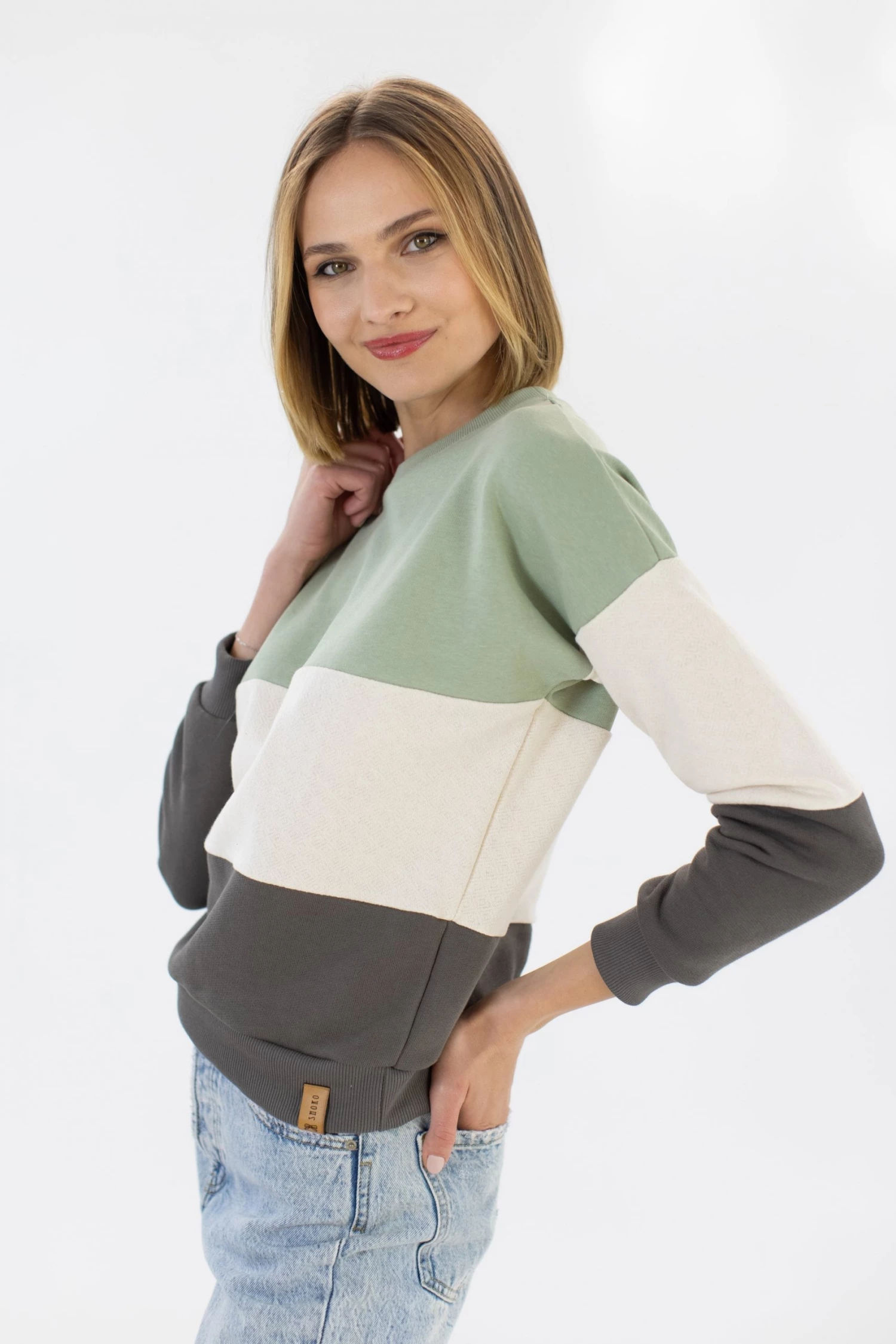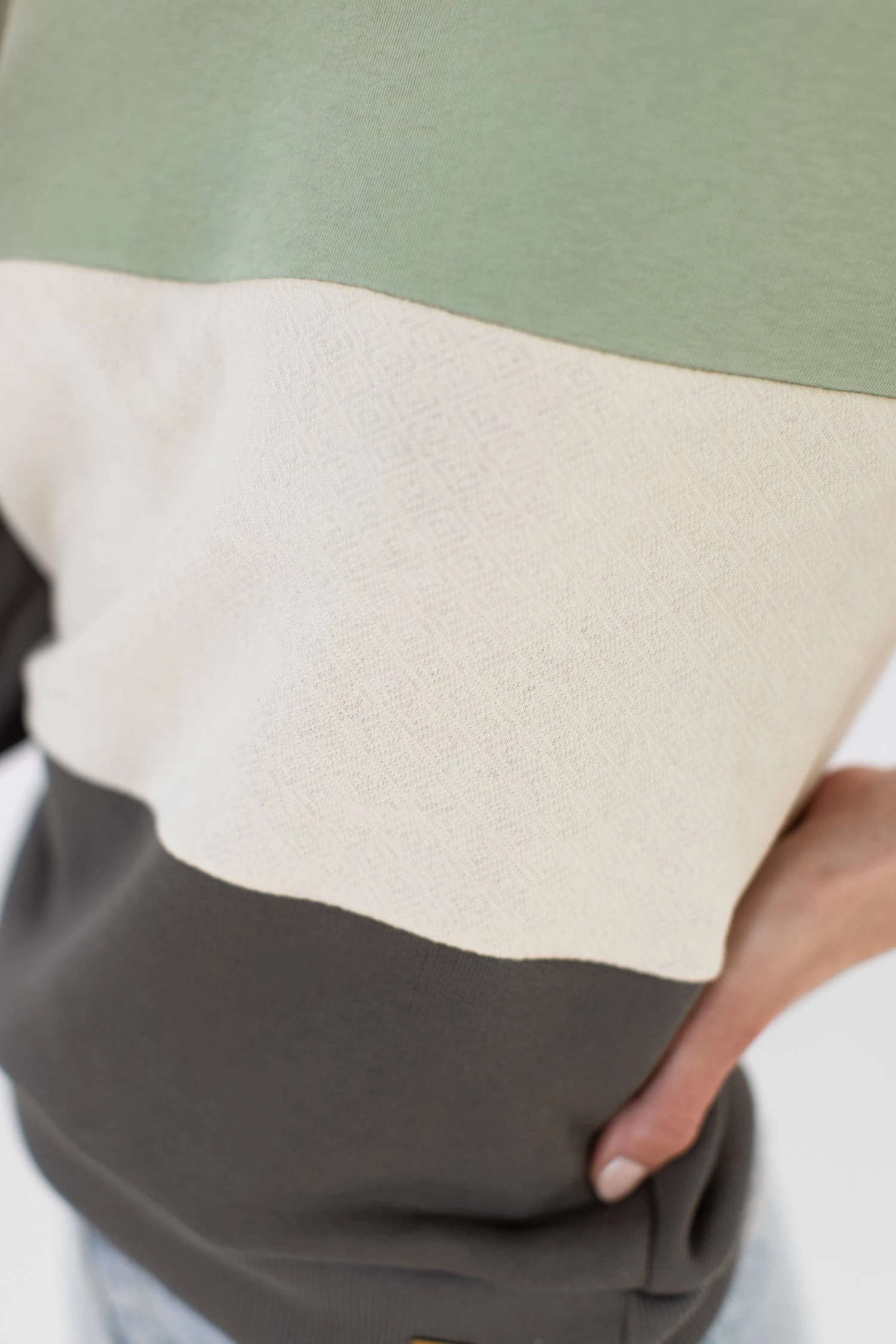 - Colour blocking (pastel green, beige & dark grey)