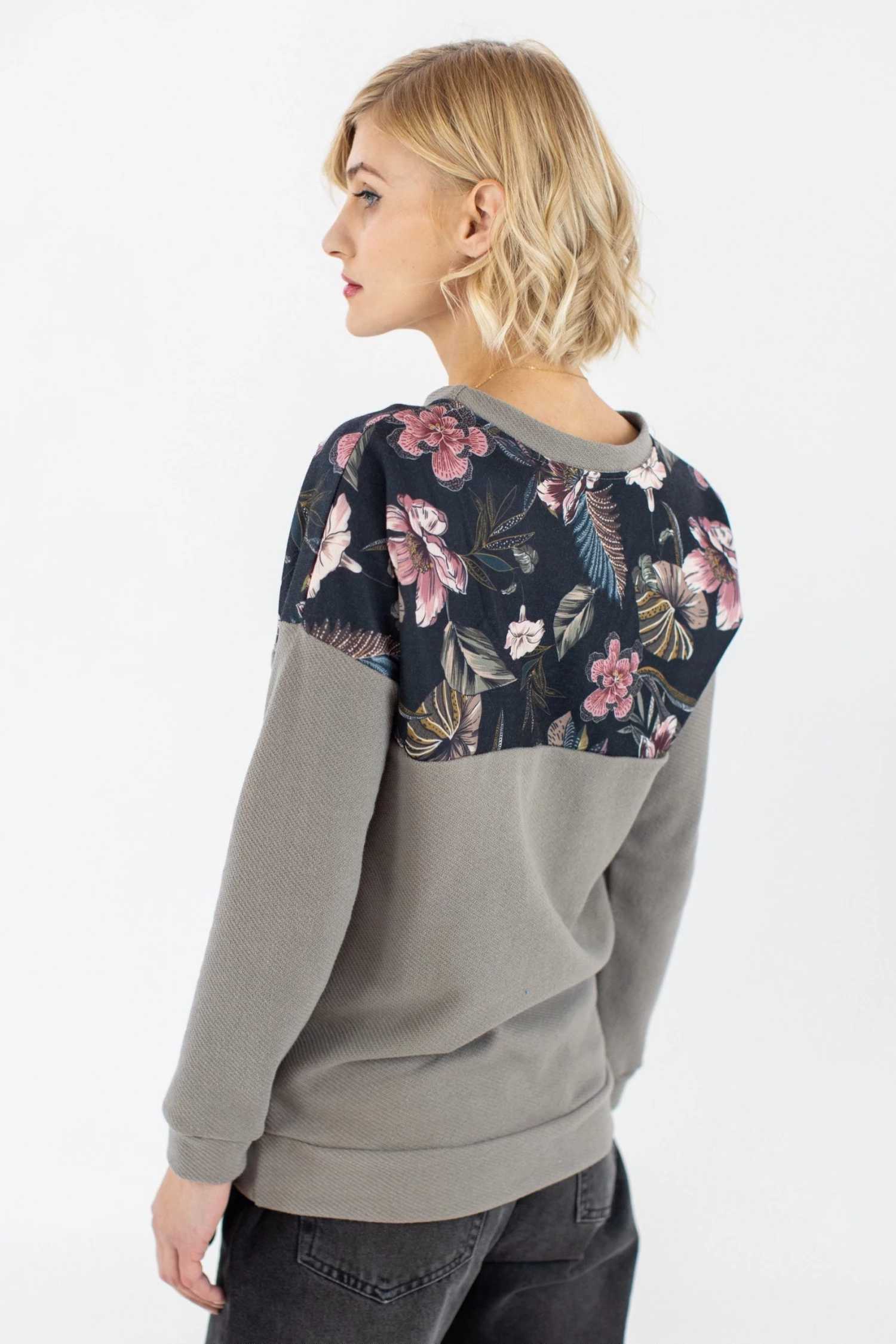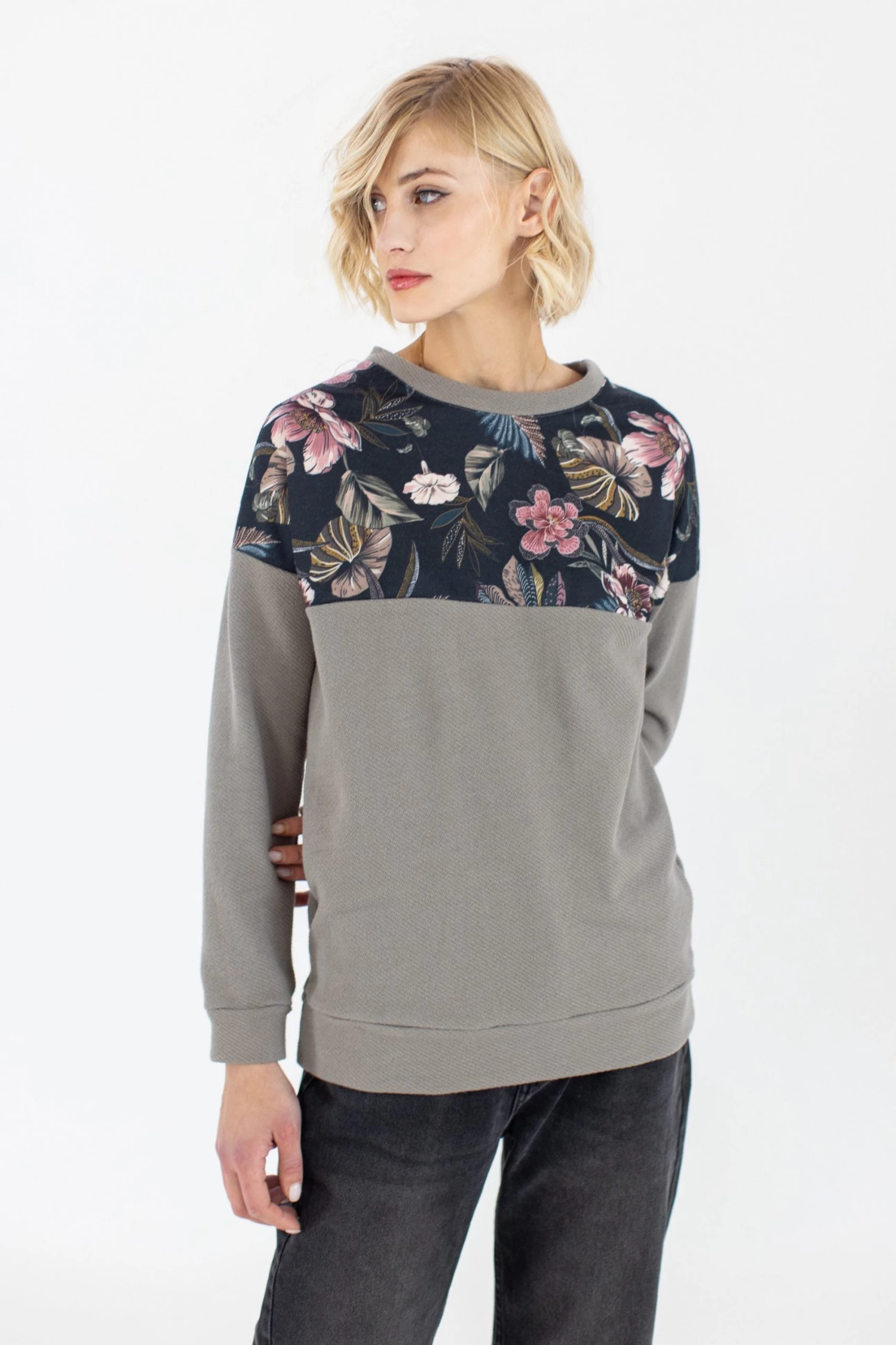 Sweater ‘Phoria’ in olive. Crafted from the signature color block, the top is a floral orchid print and the lower part is made of a soft and structured olive fabric.A great choice to be warm and elegant all day. Pair it with denims and a bold necklace and get ready!