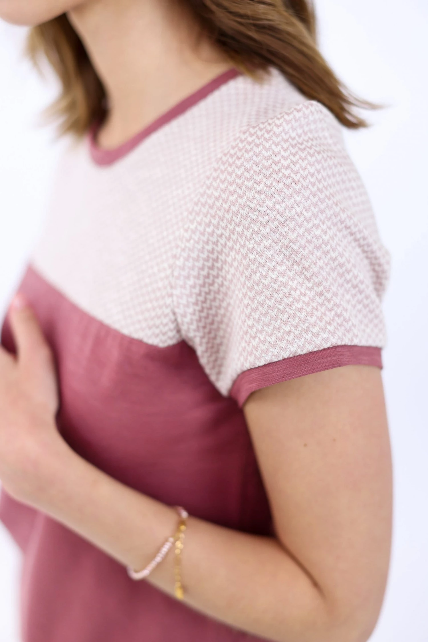 Not your average basic top. This short sleeved top in dusty pink has a chevron patterned upper part and sleeves. A no-brainer outfit paired with your fave jeans and sneakers. Throw on a denim jacket adding extra coolness.