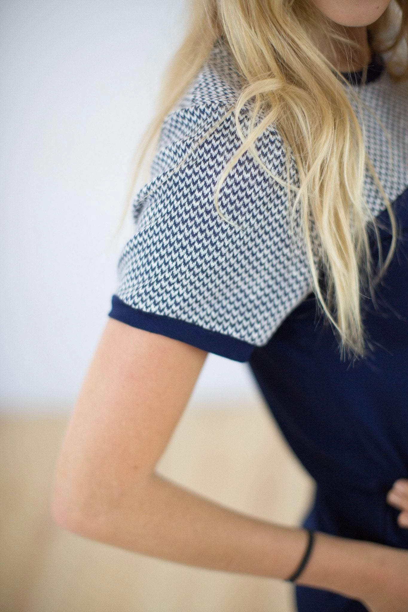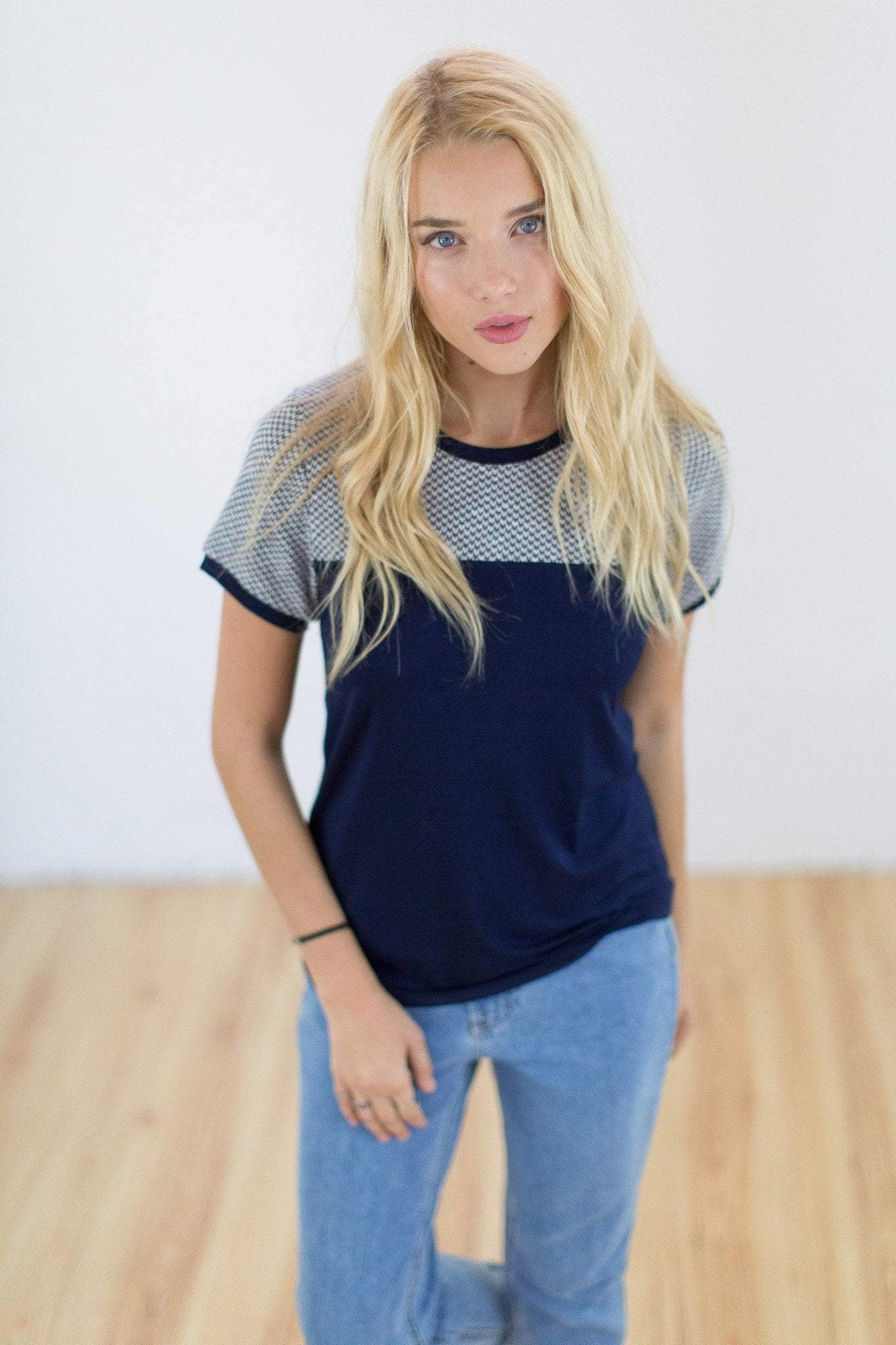 Not your average basic. This short sleeved navy top has a chevron patterned upper part and sleeves. A no-brainer outfit paired with your fave jeans and sneakers. Throw on a denim jacket adding extra coolness.