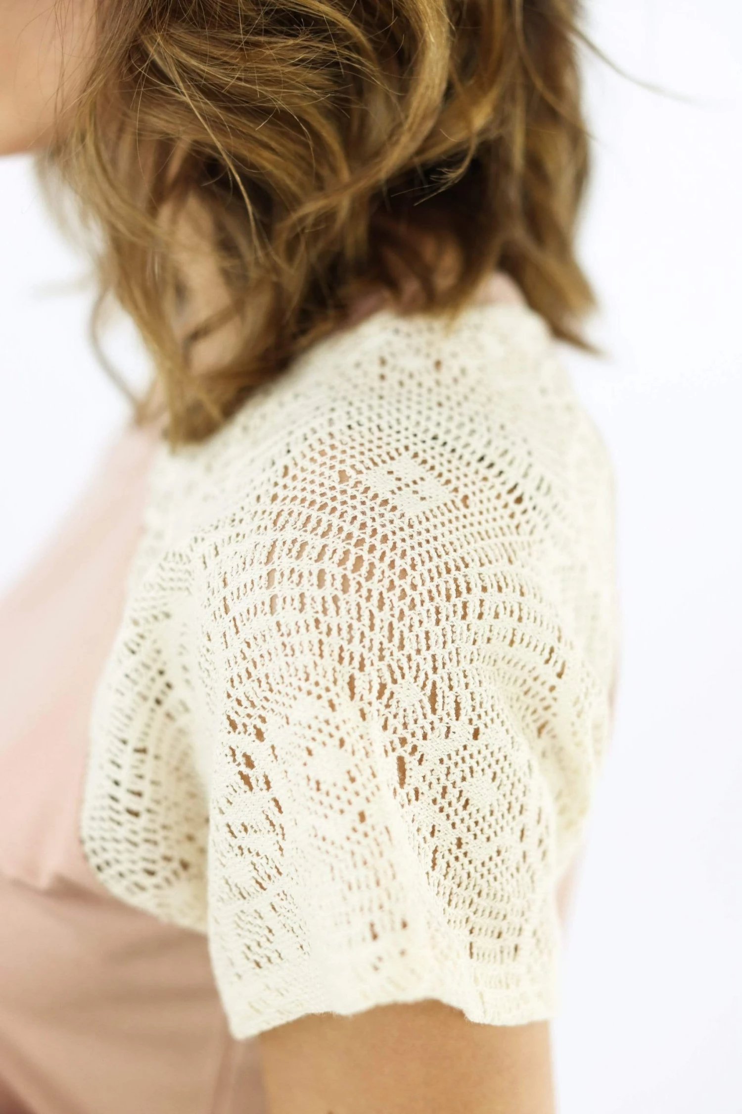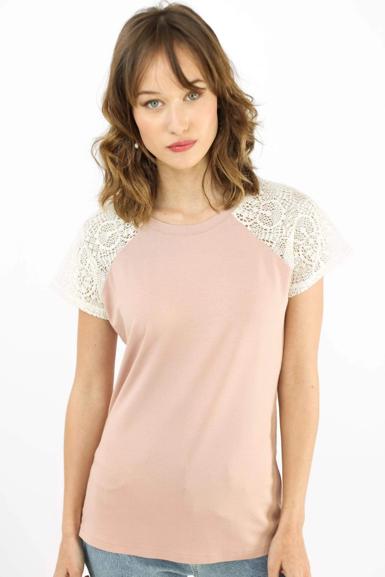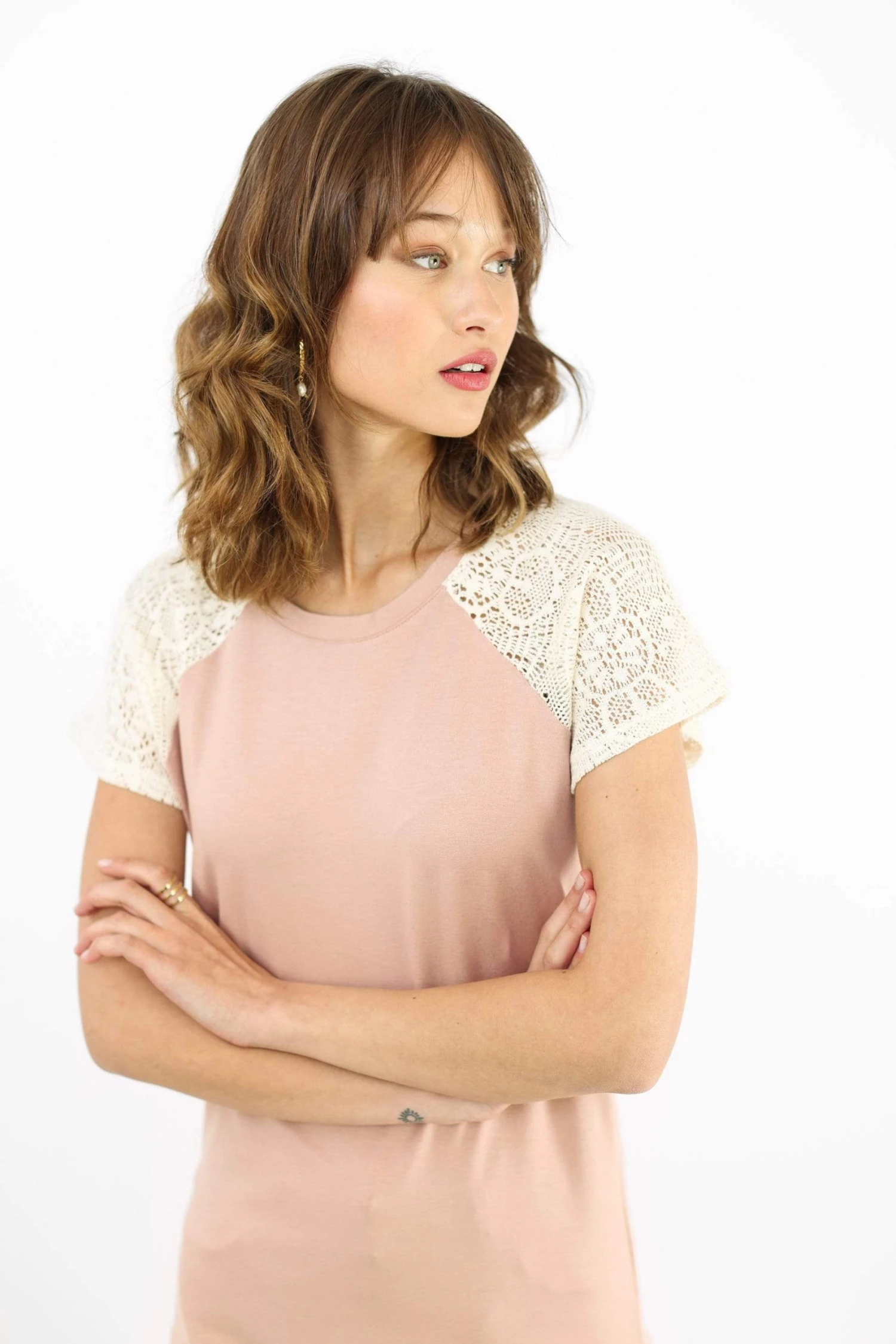The elegant t-shirt Alex in pink. The shoulder area is adorned with a beautiful cream lace patern. Romantic, playful, and easy to combine!