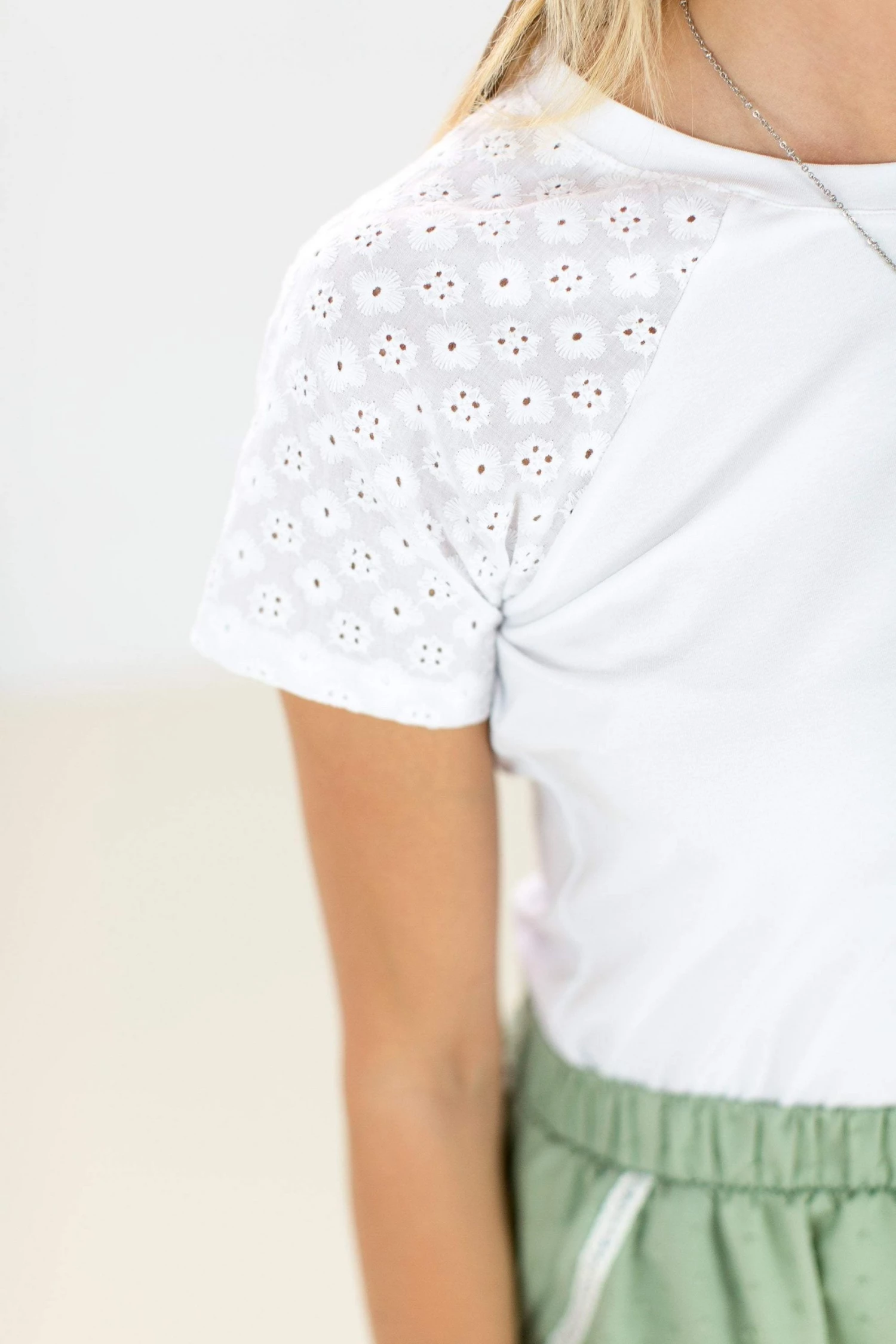 Elegant T-shirt made of short cotton fabric. The shoulder area is adorned with a white hole lace which gives an elegant and girly touch. An everyday look that will highlight your summer tan! Easy to wear and combine.