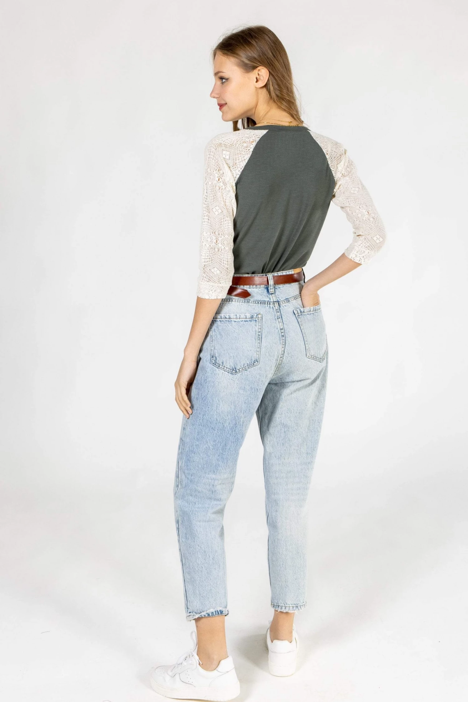 The “Eleven” top is made of a soft olive fabric, with cream-colored 3/4 lace sleeves. Relaxed fit, retro vibes, this is everything you hoped a t-shirt could be! A pair of mom jeans, your denim jacket and you’re all set!