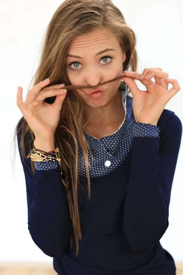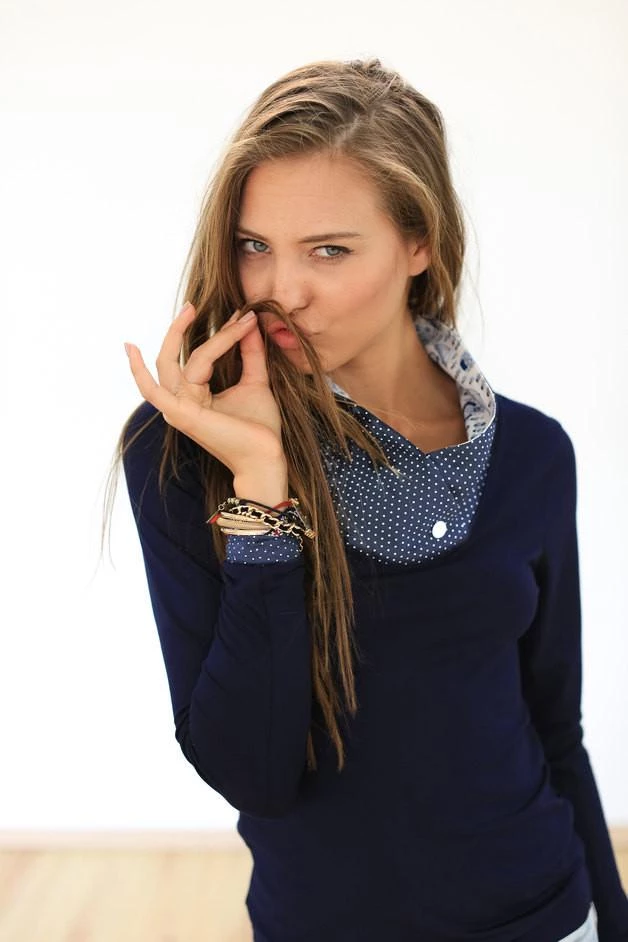Elegant long-sleeved top in a navy cotton jersey with high collar. The collar and cuffs of this top are crafted from a navy and cream polka dot print viscose fabric. The collar is lined with a cute blue and white printed cotton fabric. Wear with your go-to jeans for a casual daytime look!