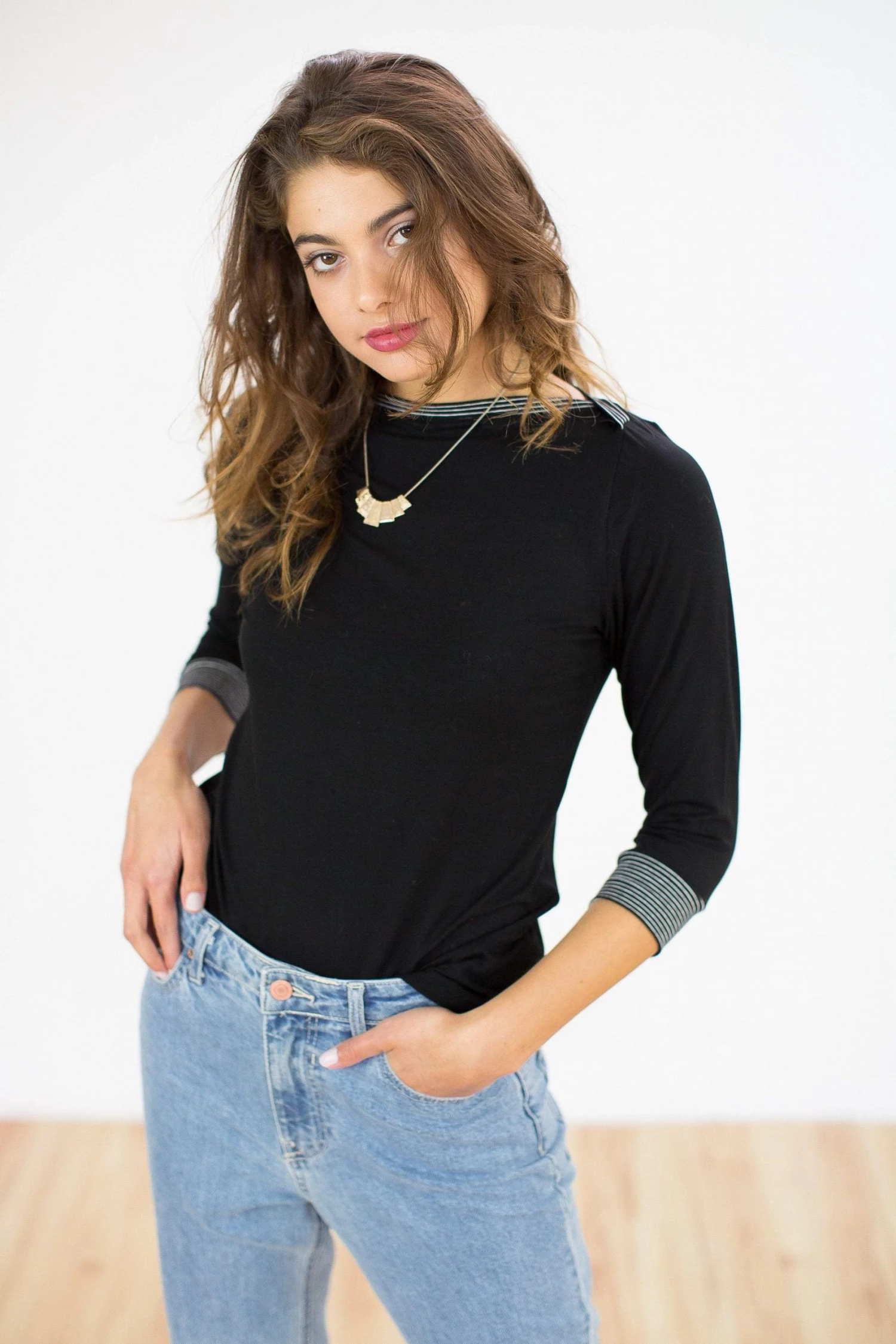 Long-sleeve top āJuneā in total black. This is a beautiful top with 3/4 length sleeves and a wide boat neck. The trimming of the neckline and the sleeves is crafted from aĀ black and white, thin, stripedĀ viscose fabric. This top is perfect for any season and itās easy to match with any jeans you own. Soft feels and comfy design for a casual look! It’s a best seller!