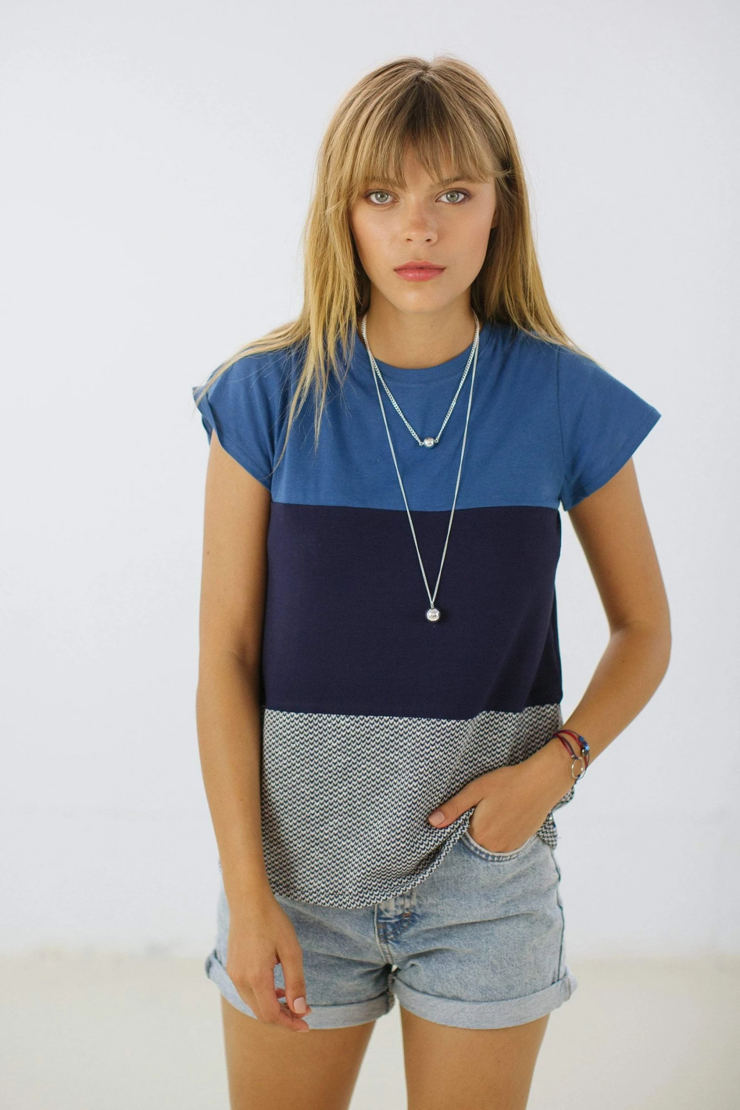 Top Mia crafted in a cool colour-block design. A cute blue fabric at the top, followed by an extra soft dark blue in the middle and finishing with some navy chevron pattern. A statement top, for a fun and cool outfit. Wear with a simple pair of denim and your fave sneakers!Â