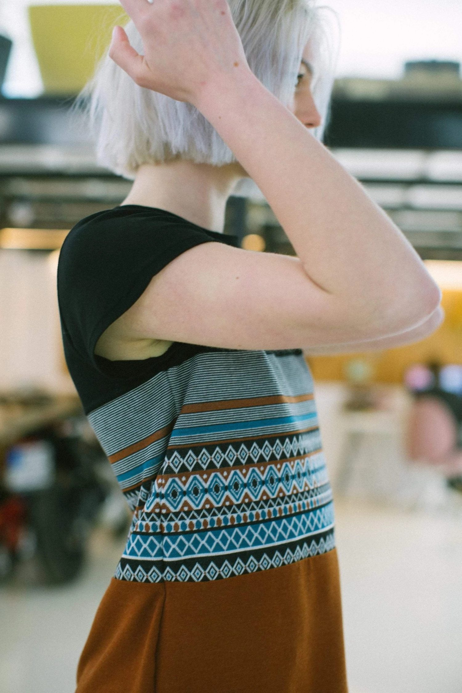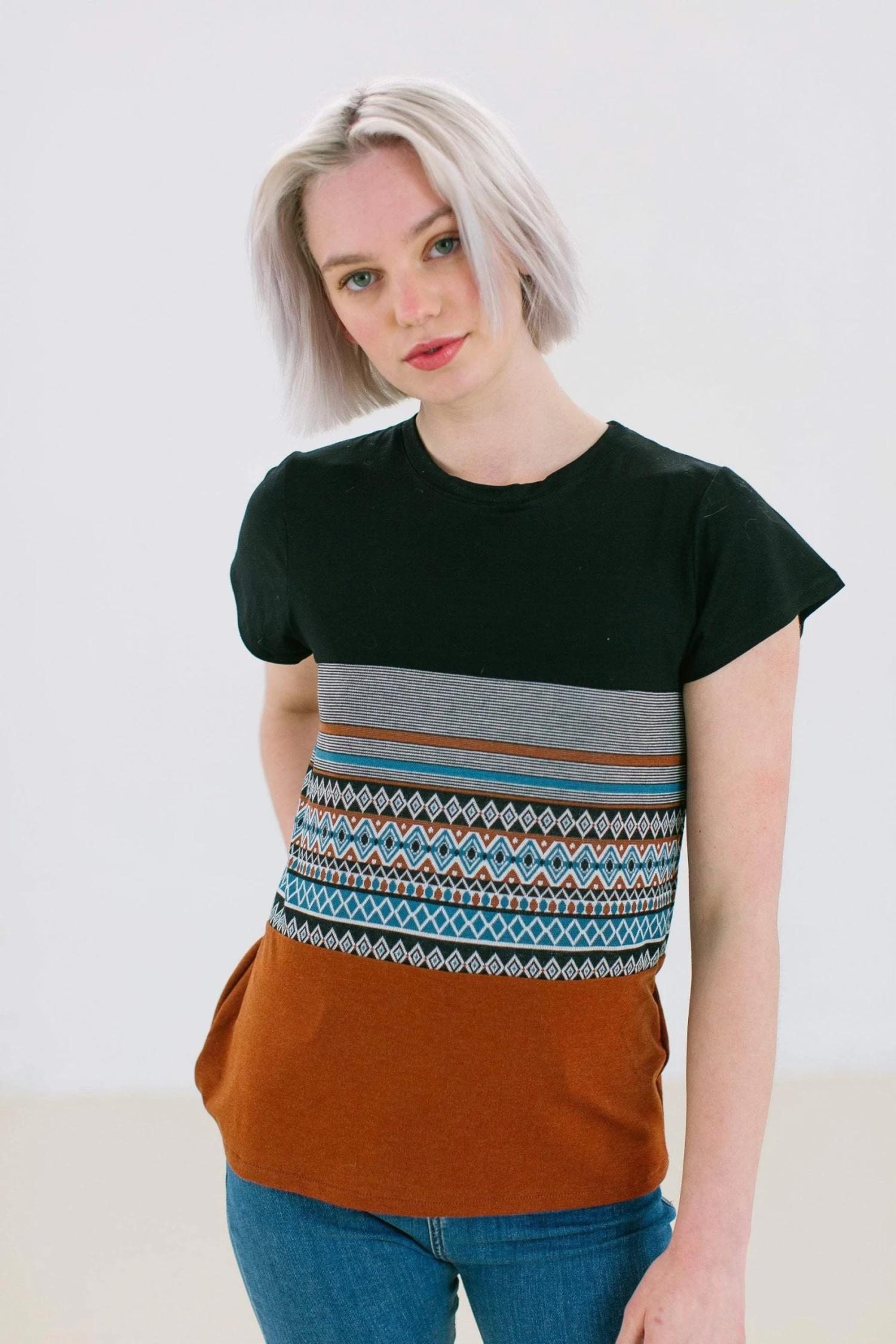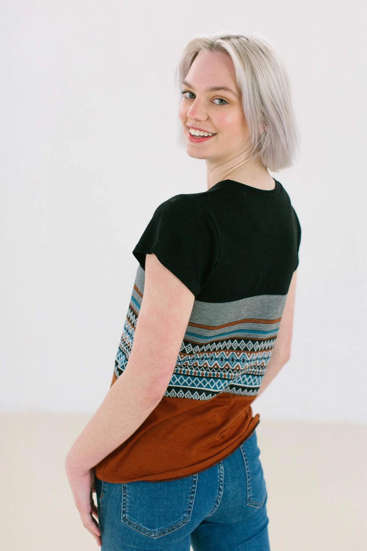 Top Mia crafted in a cool color-block design. A cute black fabric at the top, followed by a funky aztec striped pattern in the middle and a soft brown fabric at the bottom. A statement top, for a fun and cool outfit. Wear with simple denim and your fave sneakers!Â