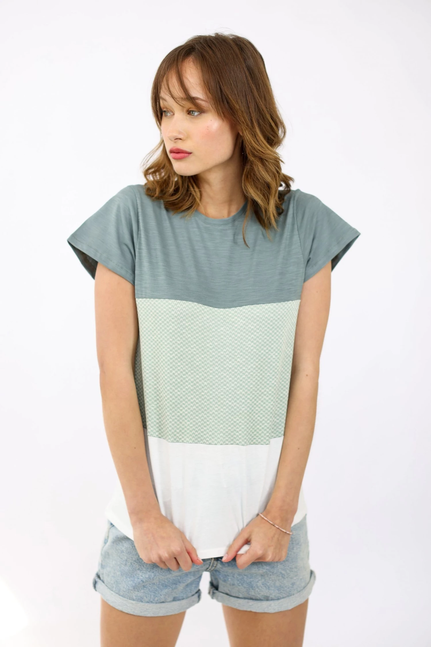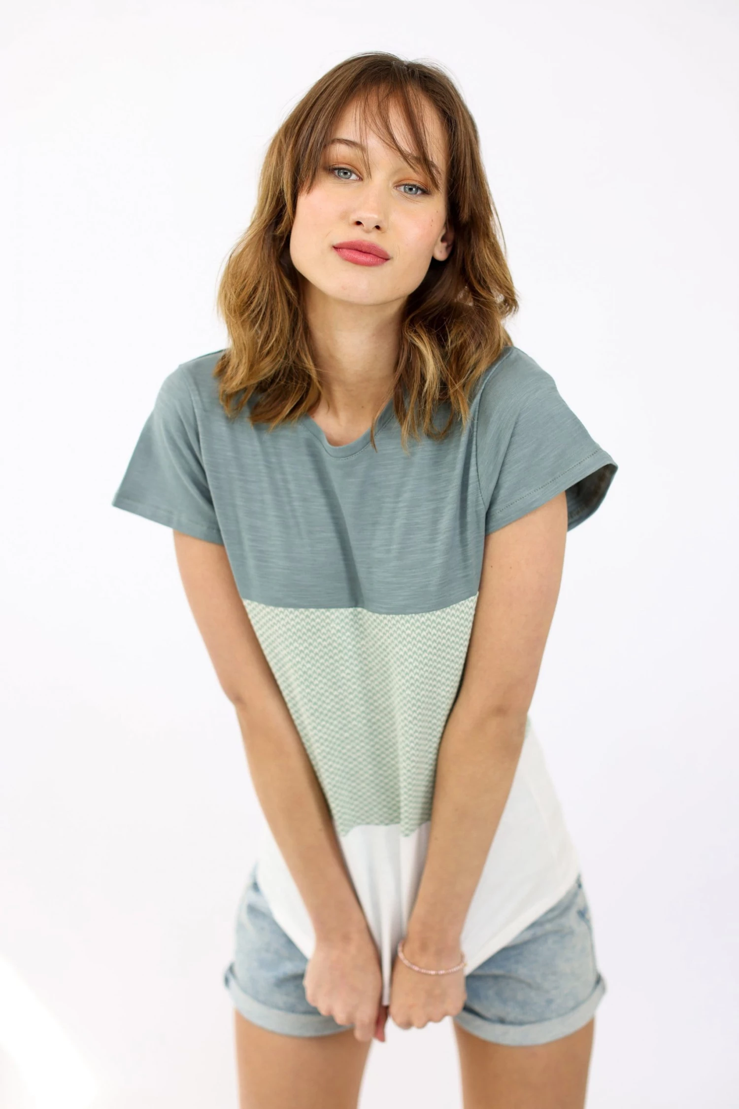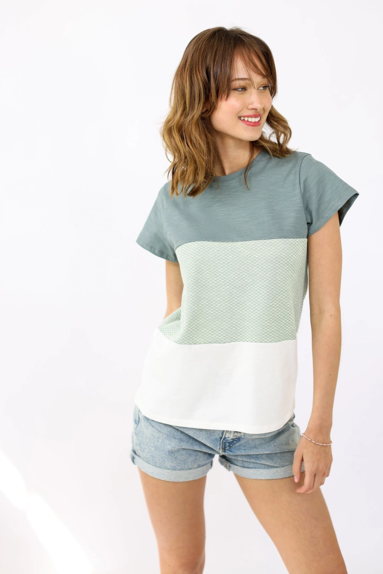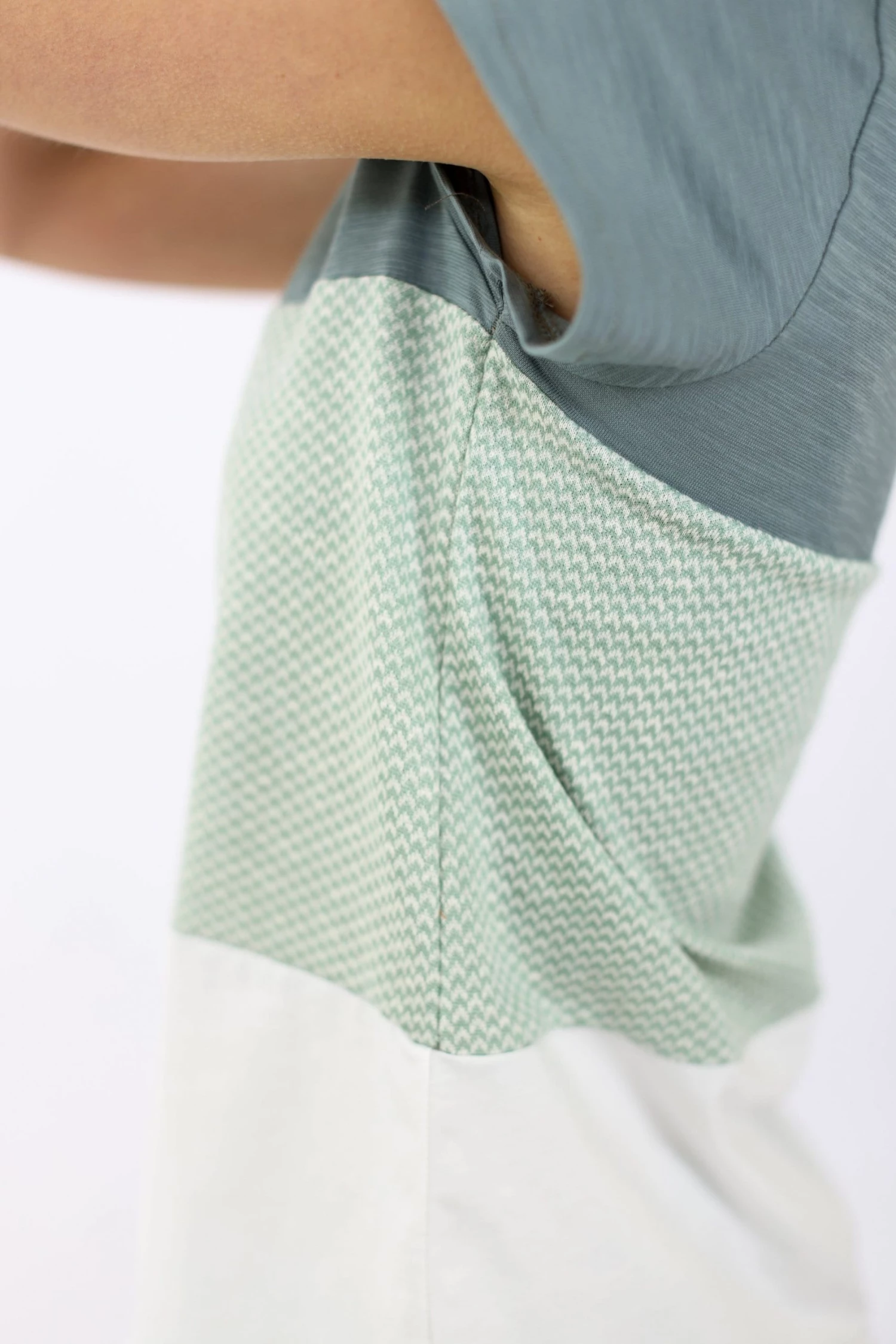 Top Mia at the coolest color block design! Olive green on top, followed by a green and cream chevron pattern in the middle part and finishing with a white bottom part. A statement top for a cool yet girlish outfit. Wear it with jeans and your favourite sneakers!Â