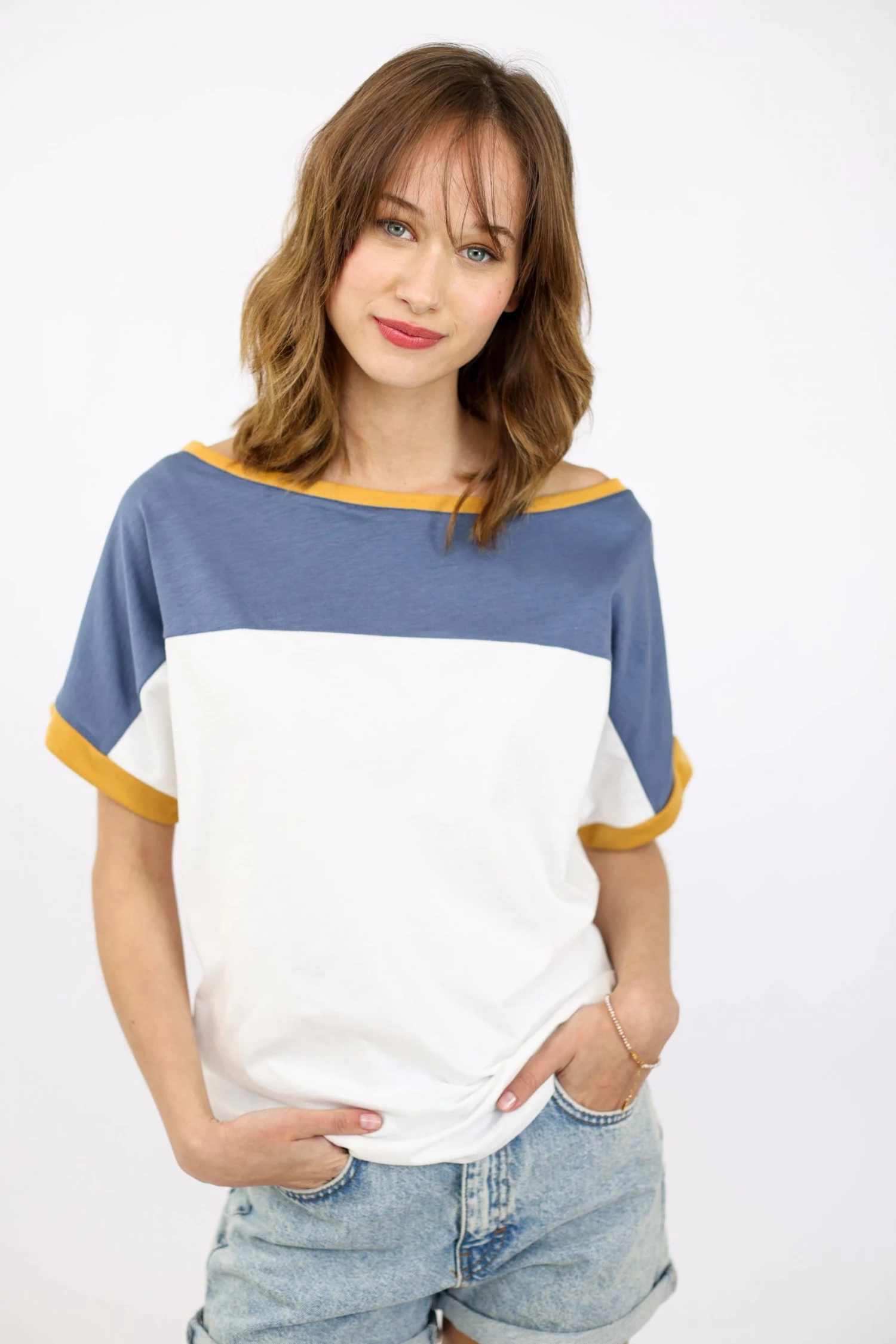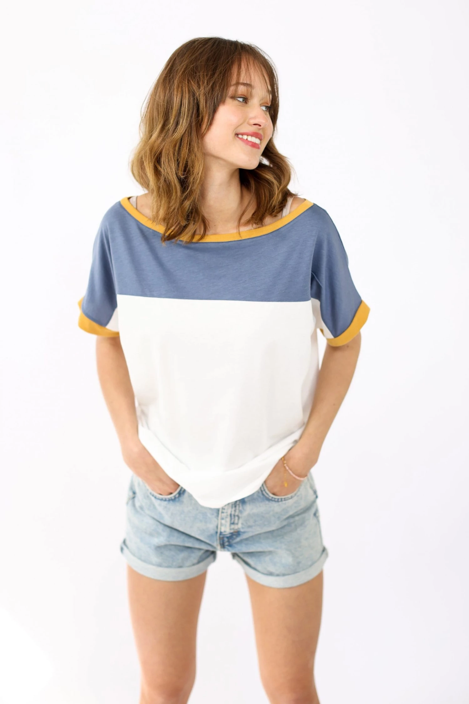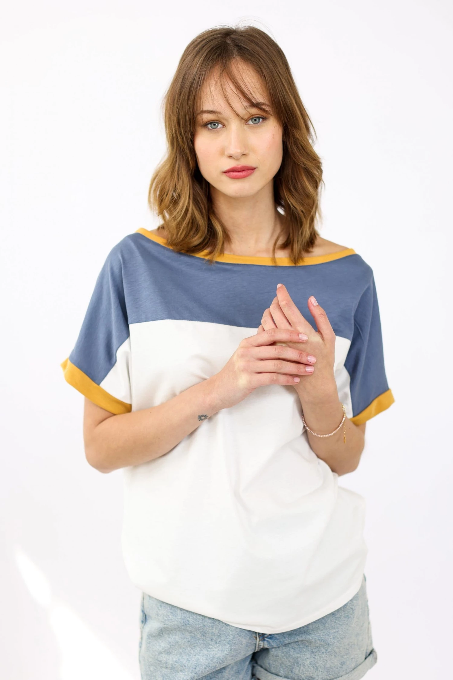 The “Squares” top with color block design in navy blue and white with mustard details. A short-sleeved top made of soft fabric. Its loose fit makes it comfortable and easy to combine!