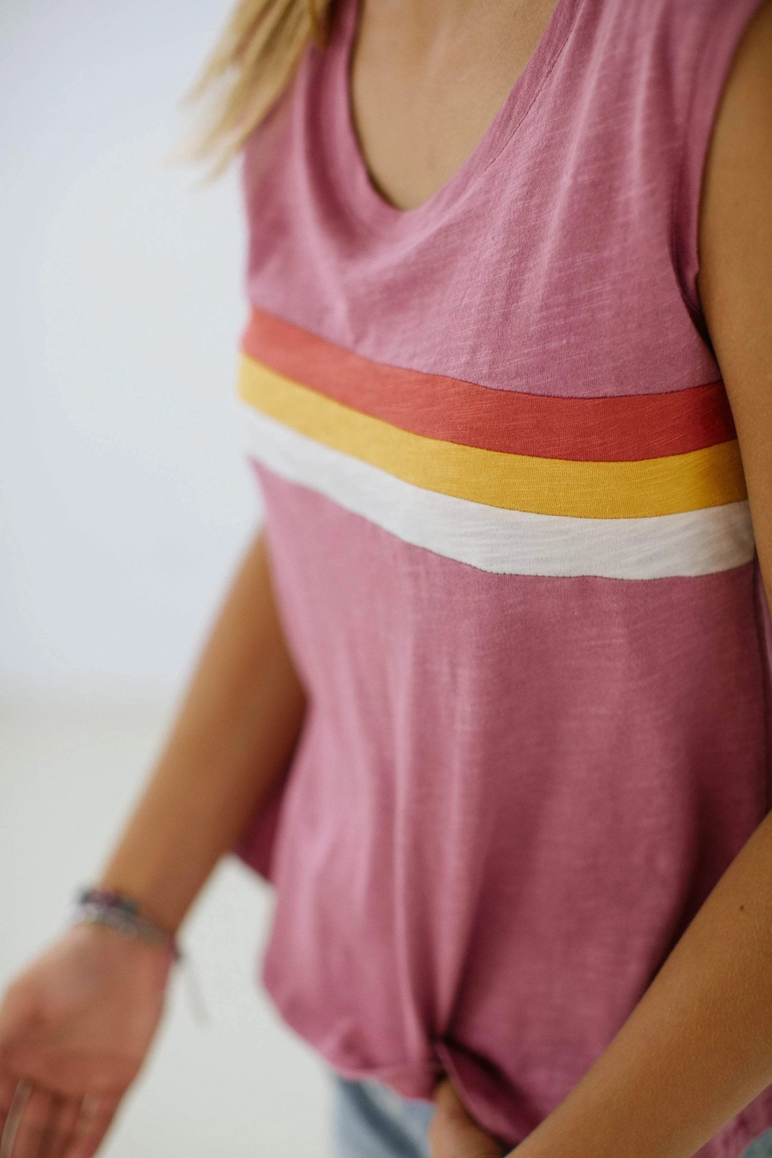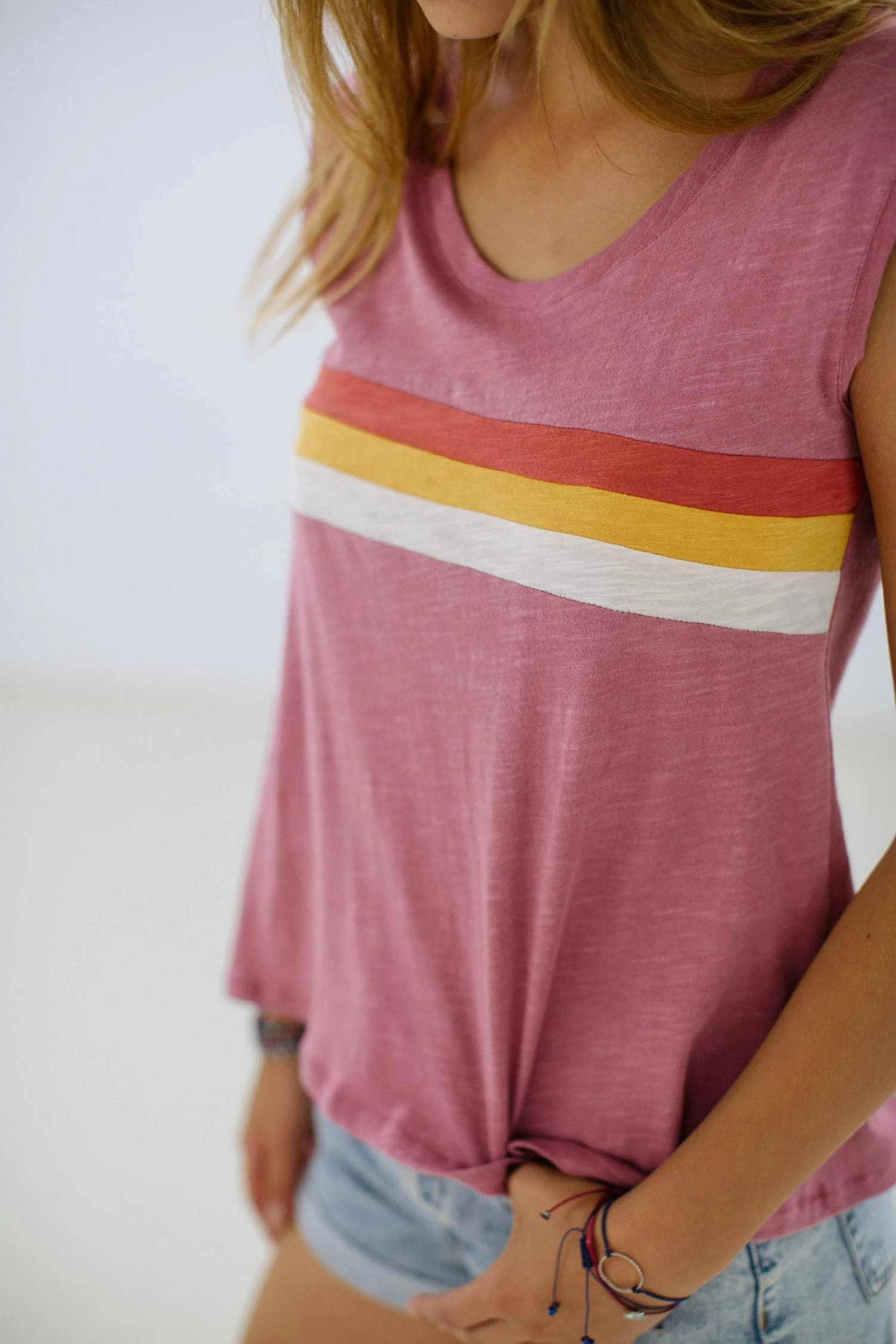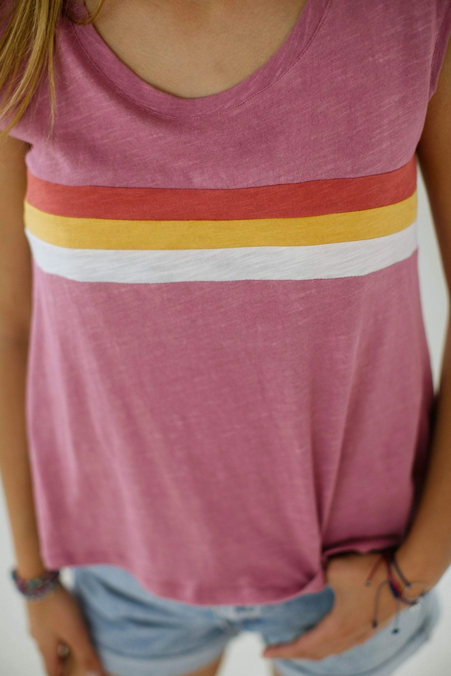 A top so retro you’re about to experience stranger things. It’s the small details such as the round flattering cut on the cleavage that make this dusky pink top stand out, and the rainbow stripes in the front give it a fun and nostalgic vibe. It has a loose, flattering fit which makes it easy to wear with anything. This is one basic you just can’t live without.