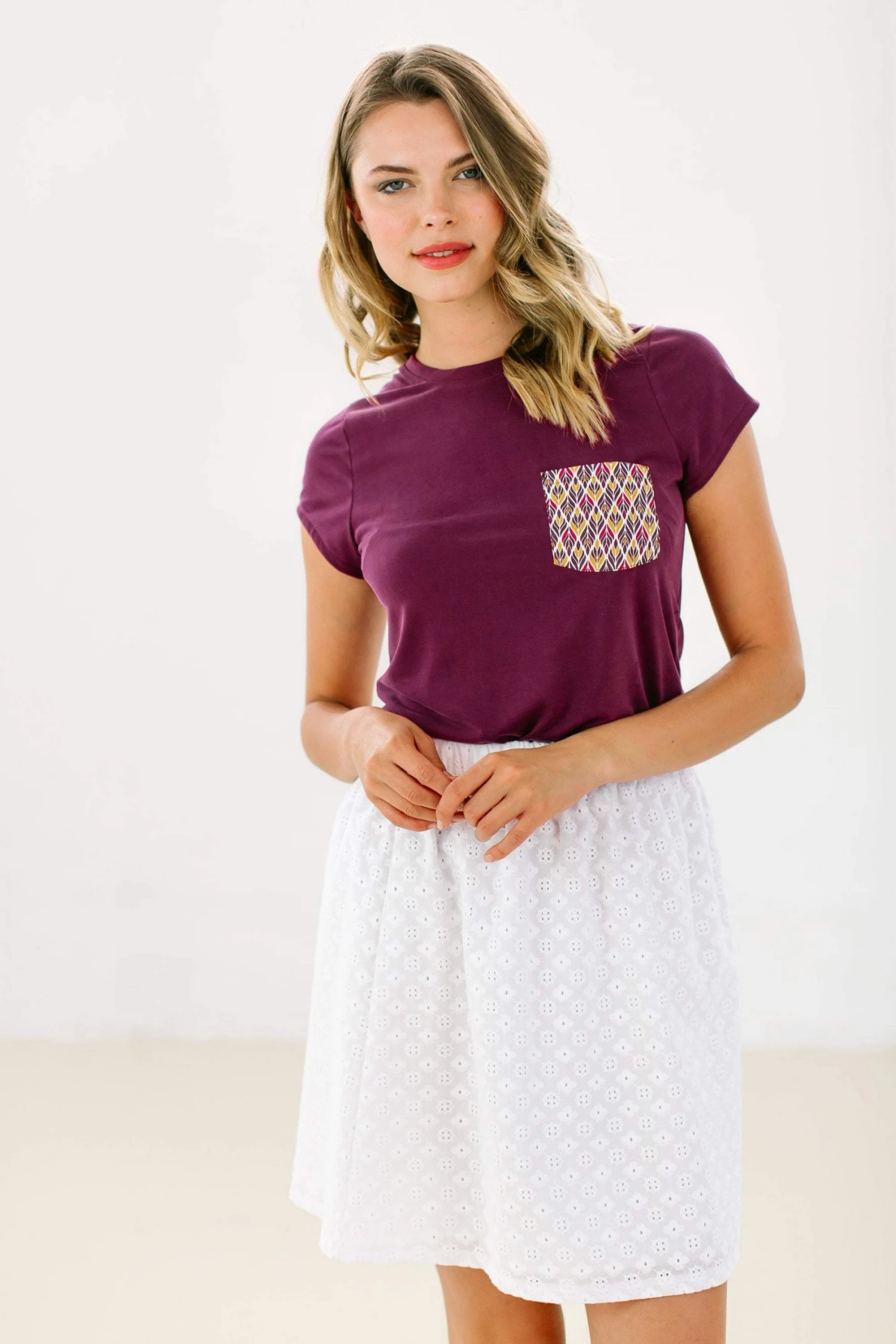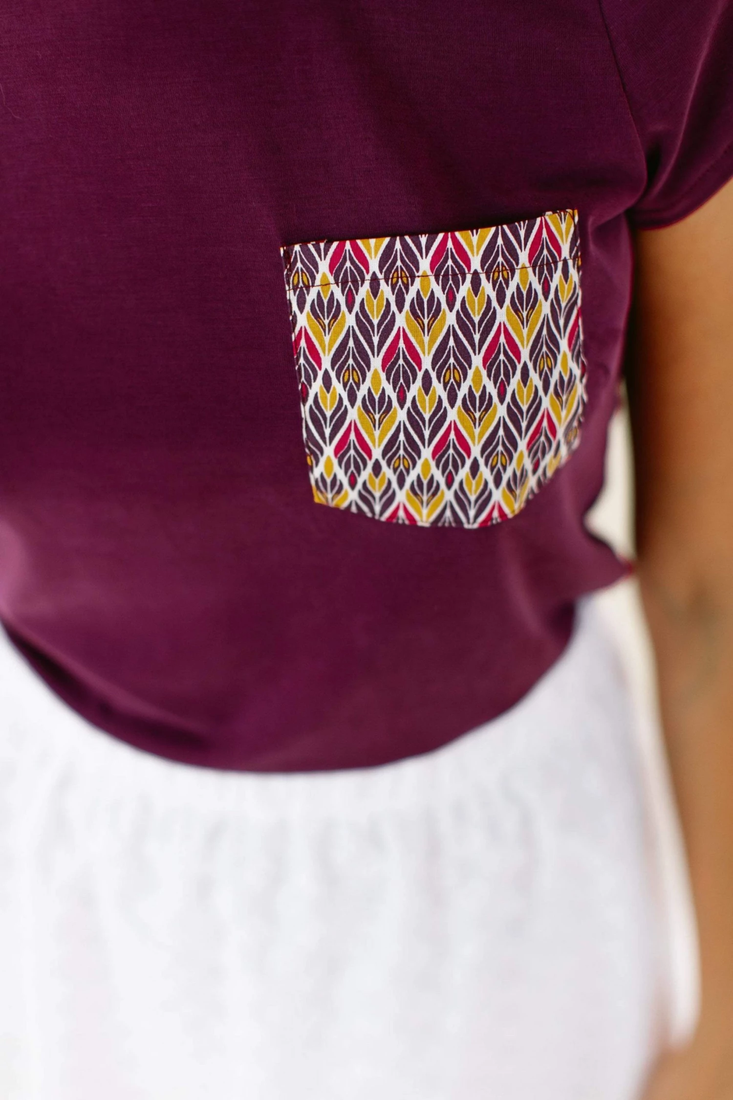 Casual t-shirt made from a very soft purple fabric with a cute feather-printed pocket in colors of purple, orange and white. Suitable for various occasions and super easy to match with your favourite outfit. Style it with denim bottoms and flat sandals!