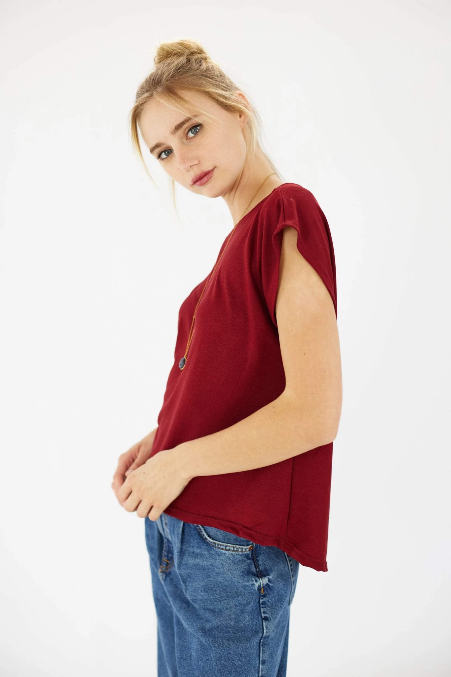 The absolute must have. The top Aria has short cut sleeves, a boatneck and a loose fit in a fantastic wine red color. Cool and comfortable, stylish in its simplicity. Ideal to be combined with high-waisted shorts, jeans and of course your skirts.