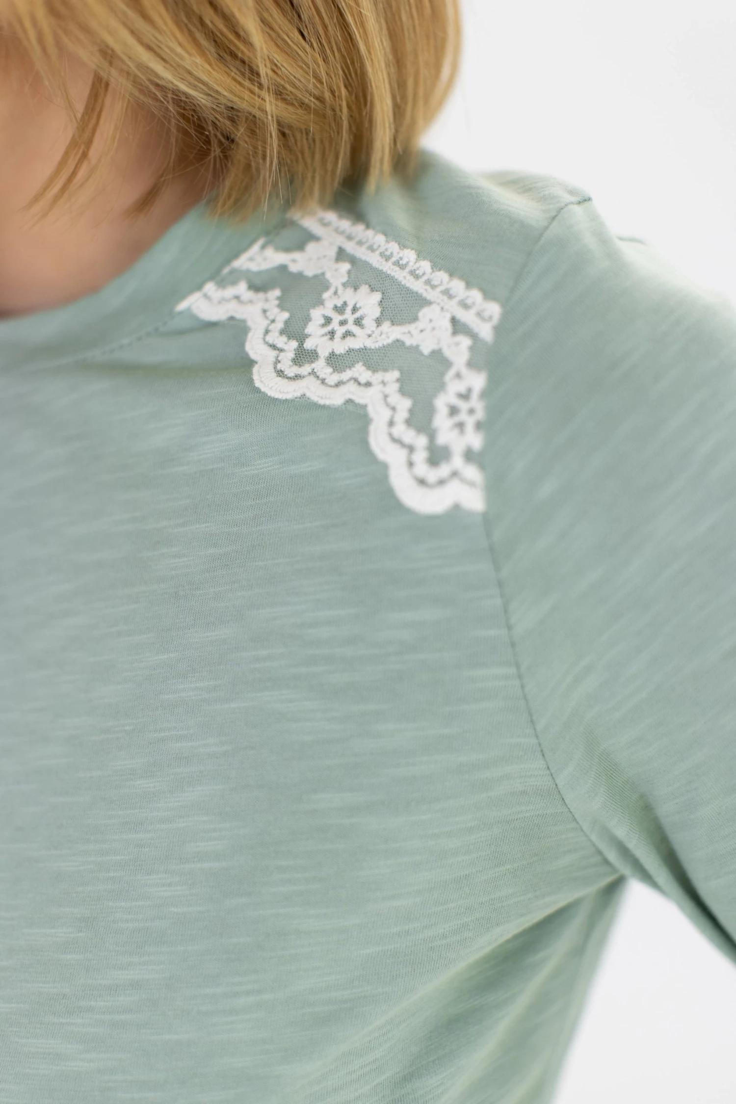 - White laceĀ detailĀ near the shoulders