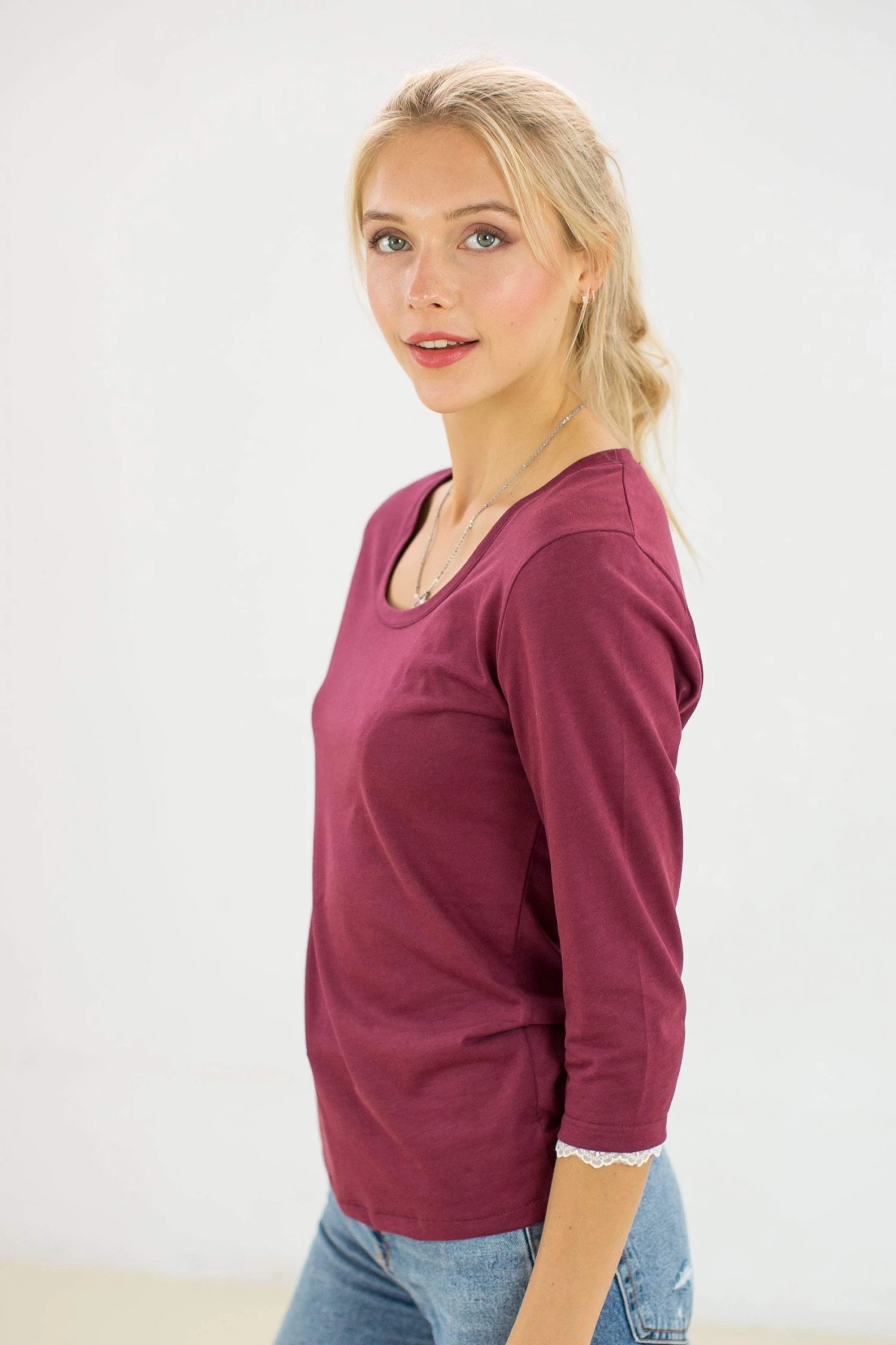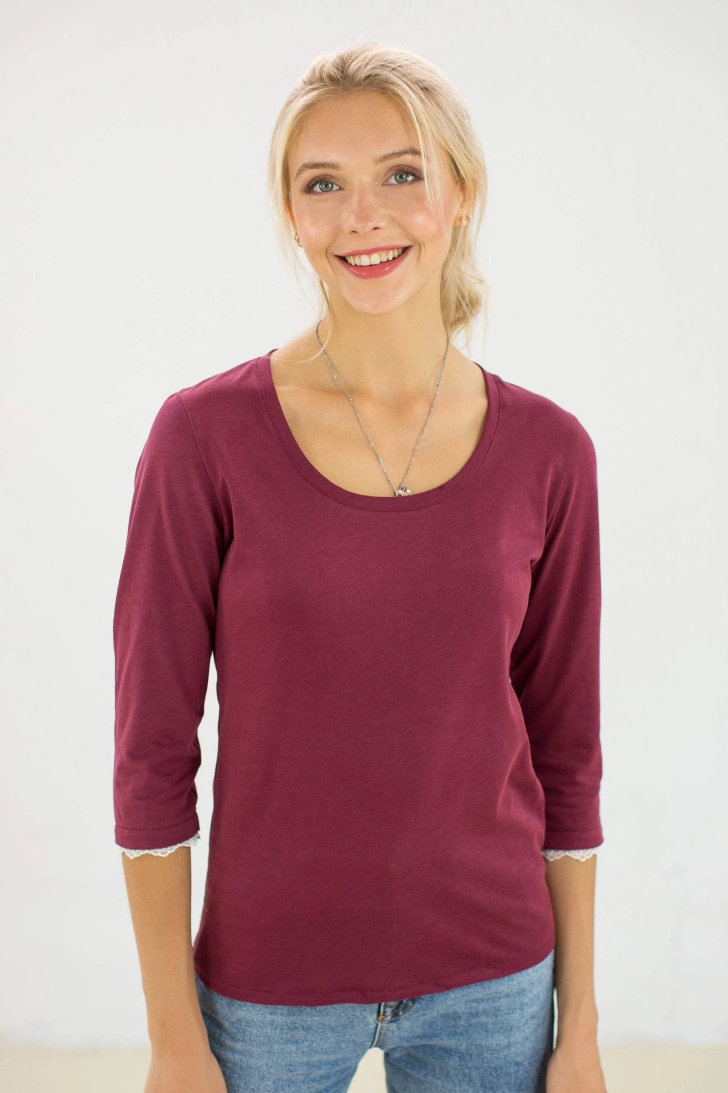 Monochrome ‘Elektra’ in burgundy colour with a round neck line, 3/4 sleeves and white lace details on both sleeves. It has a loose, flattering fit making it easy to wear for a casual office look or a ride at the park. An absolute must for this autumn!Â