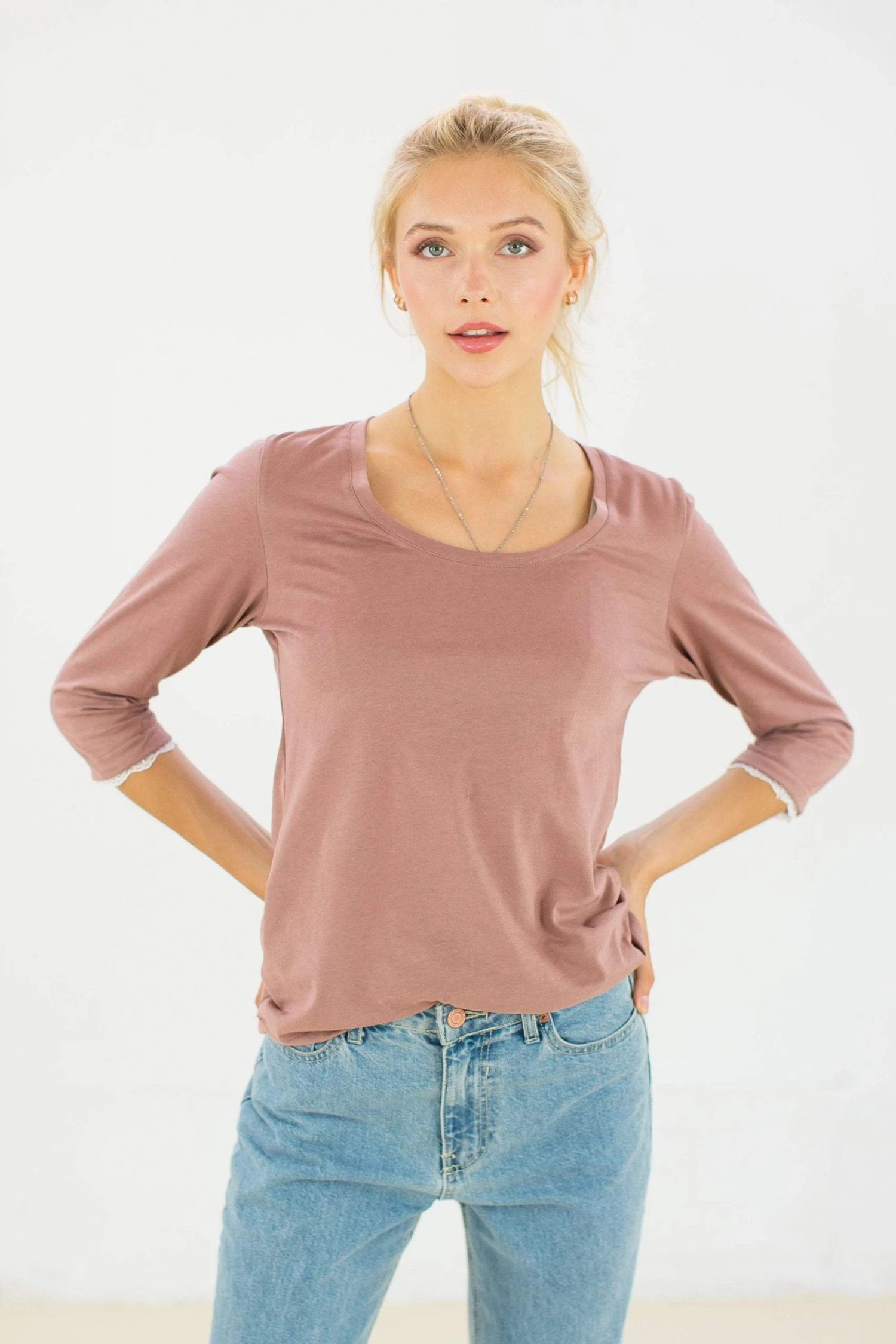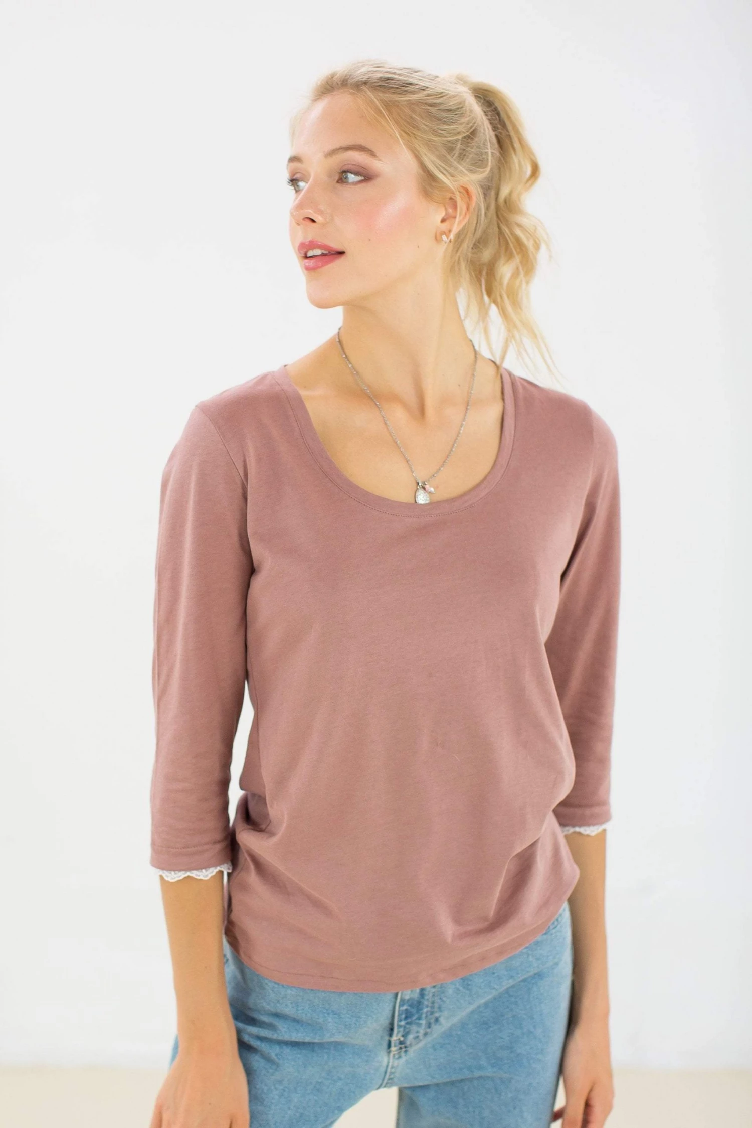 Meet your new favourite long-sleeved top! Monochrome ‘Elektra’ in dusty pink colour with a round neck line, 3/4 sleeves and white lace details on both sleeves. It has a loose, flattering fit making it easy to wear for a casual office look or a ride at the park. An absolute must for this autumn!Â