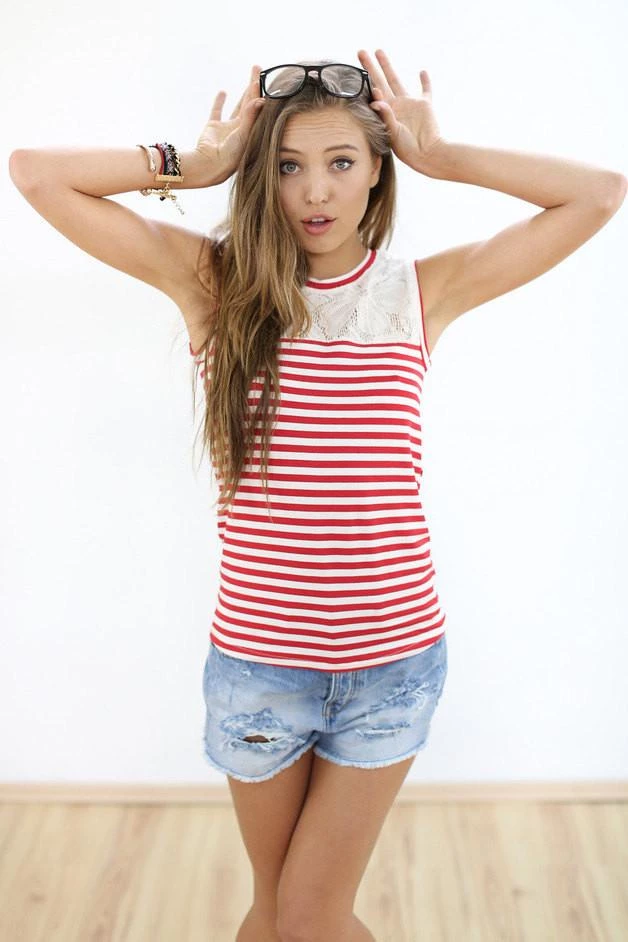 Sleeveless summer top in red and cream stripes. This top features a cream lace panel along the neckline adding a touch of elegance while the stripes keep it casual, making it easy to wear from morning to evening. Wear with your favorite denim shorts or jeans.