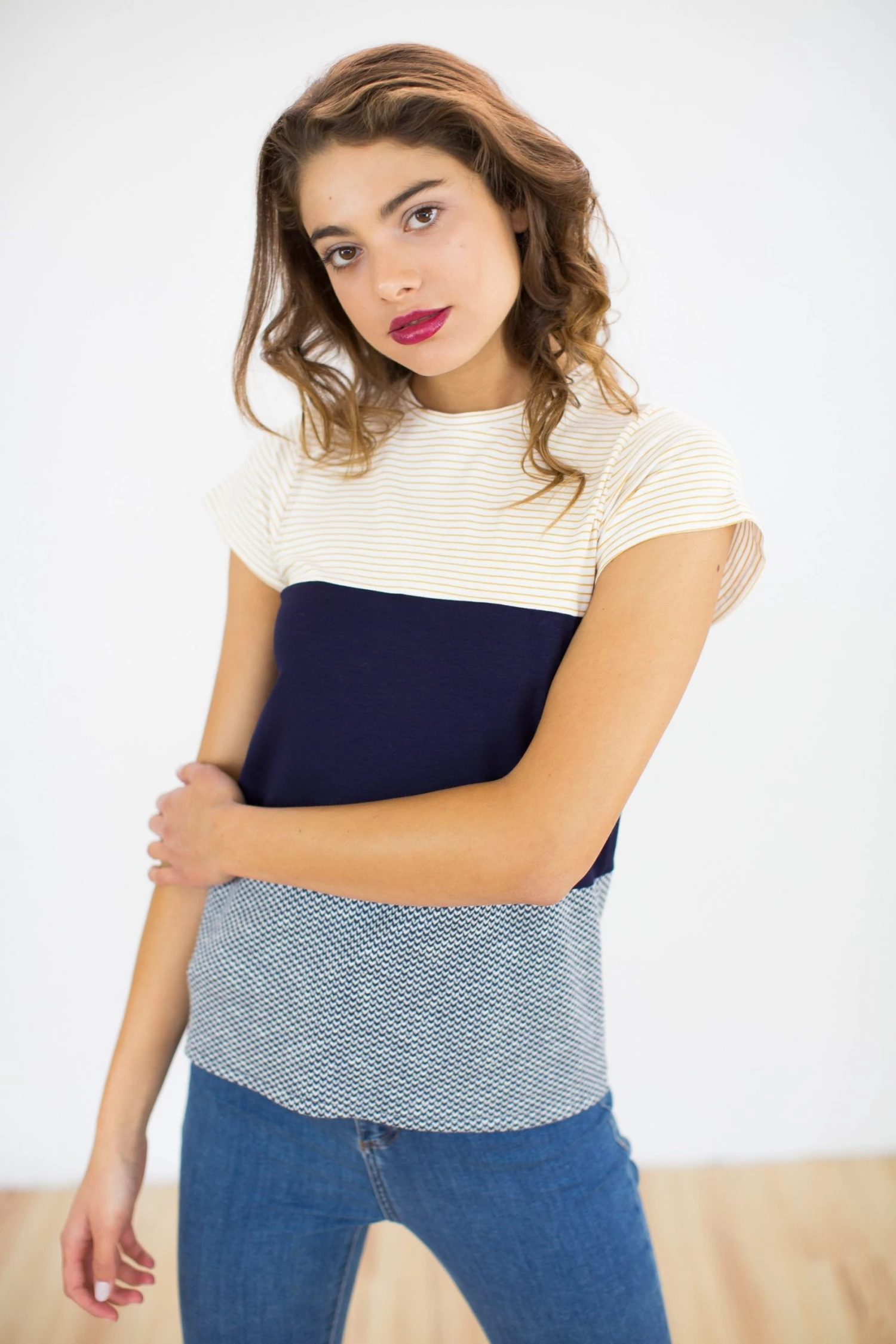 Top Mia crafted from a cool colour-block design. Cream & Yellow stripes  at the top, following an extra soft dark blue fabric in the middle and finishing with a beautiful navy chevron pattern. A statement top, for a fun and cool outfit. Wear with a simple pair of denim and your fave sneakers!Â